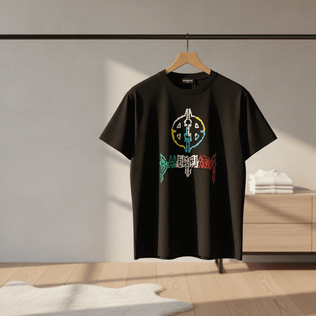Balenciaga black street style T-shirt made from soft breathable premium cotton, featuring a bold colorful totem print on the chest, unisex crew neck design for casual and trendy everyday wear.
