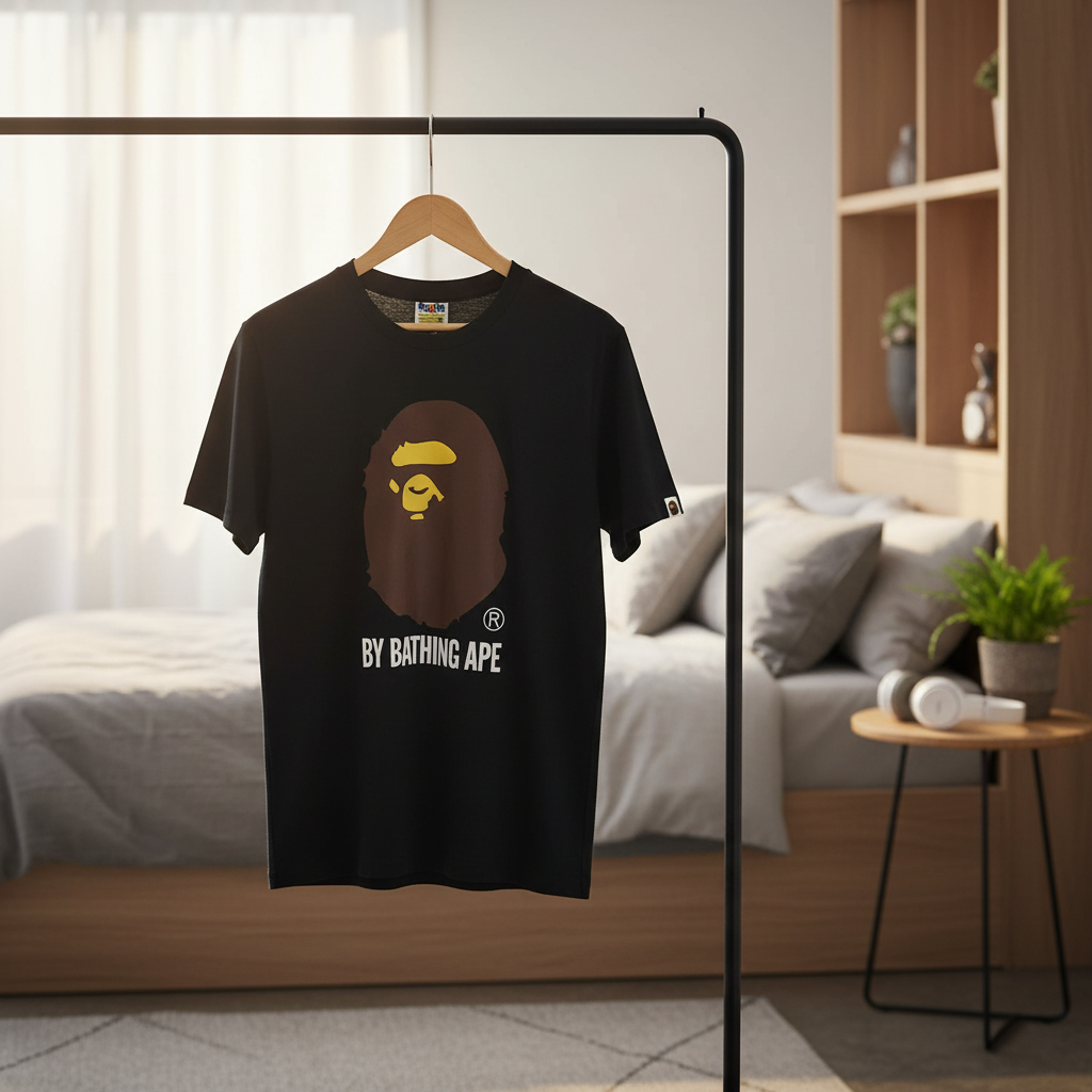 A Bathing Ape Classic Black T-Shirt featuring iconic Ape Head and BY BATHING APE logo, made of premium breathable cotton, streetwear style for men and women, perfect for casual fashion.
