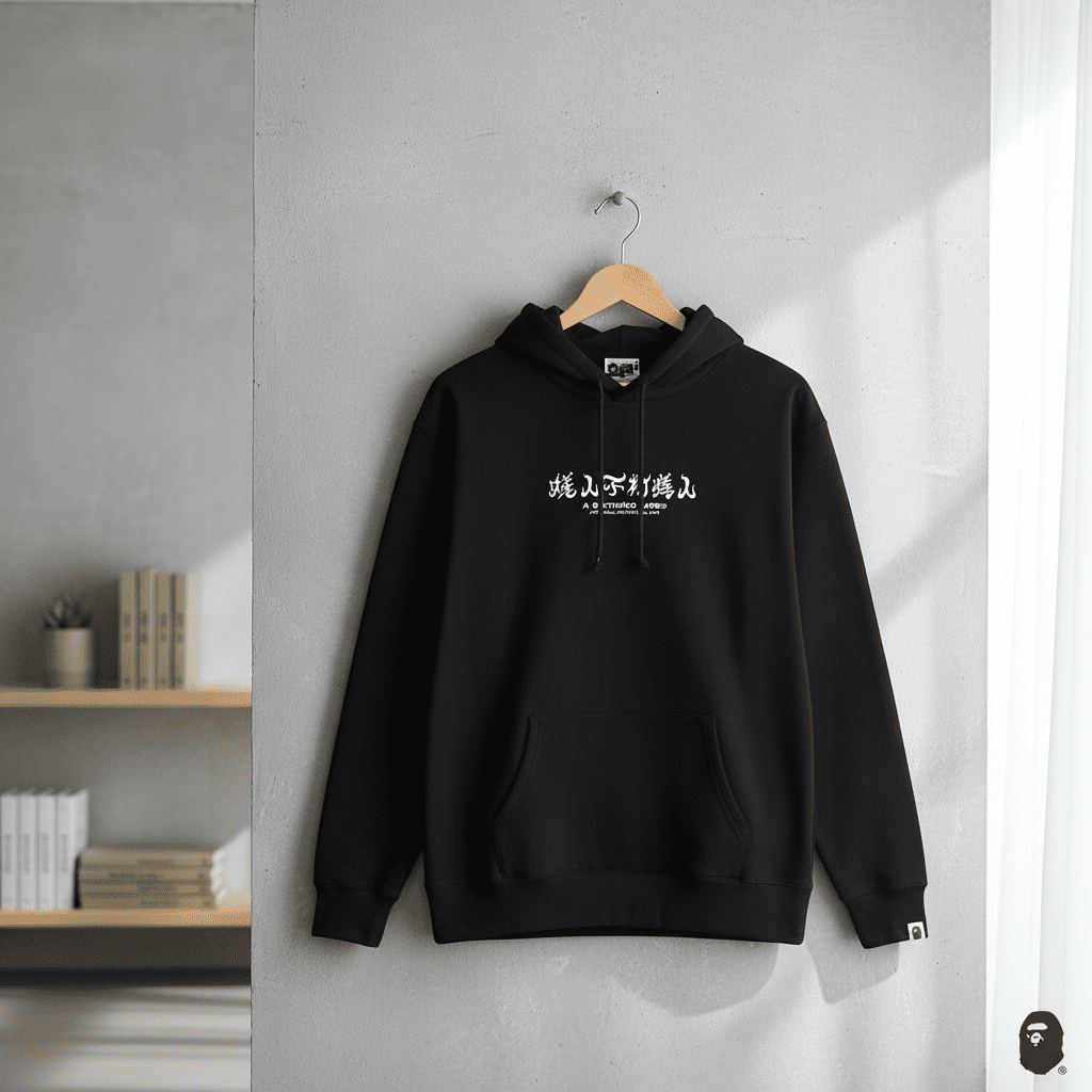 A Bathing Ape black hoodie in soft cotton, featuring front logo text and back camo Ape Head graphic. Unisex streetwear style for casual daily outfits with bold personality.