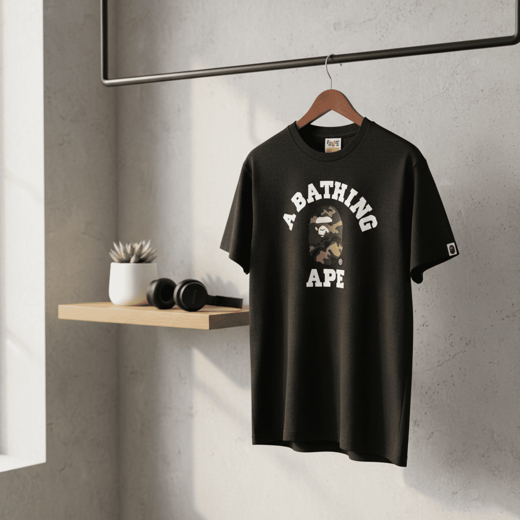A Bathing Ape Classic Black T-Shirt features iconic camo ape head and curved logo, made from soft breathable cotton, unisex streetwear style for daily casual looks.