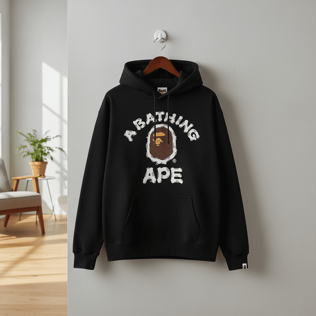 A Bathing Ape classic black hoodie made of soft cotton, featuring the iconic Ape Head and logo print, adjustable drawstring hood, kangaroo pocket, unisex streetwear style for everyday comfort.
