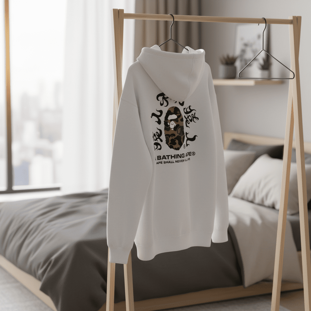 A Bathing Ape white hoodie made from premium soft breathable cotton, featuring iconic camo Ape Head and black artistic text, streetwear style, unisex, warm and casual for daily fashion.