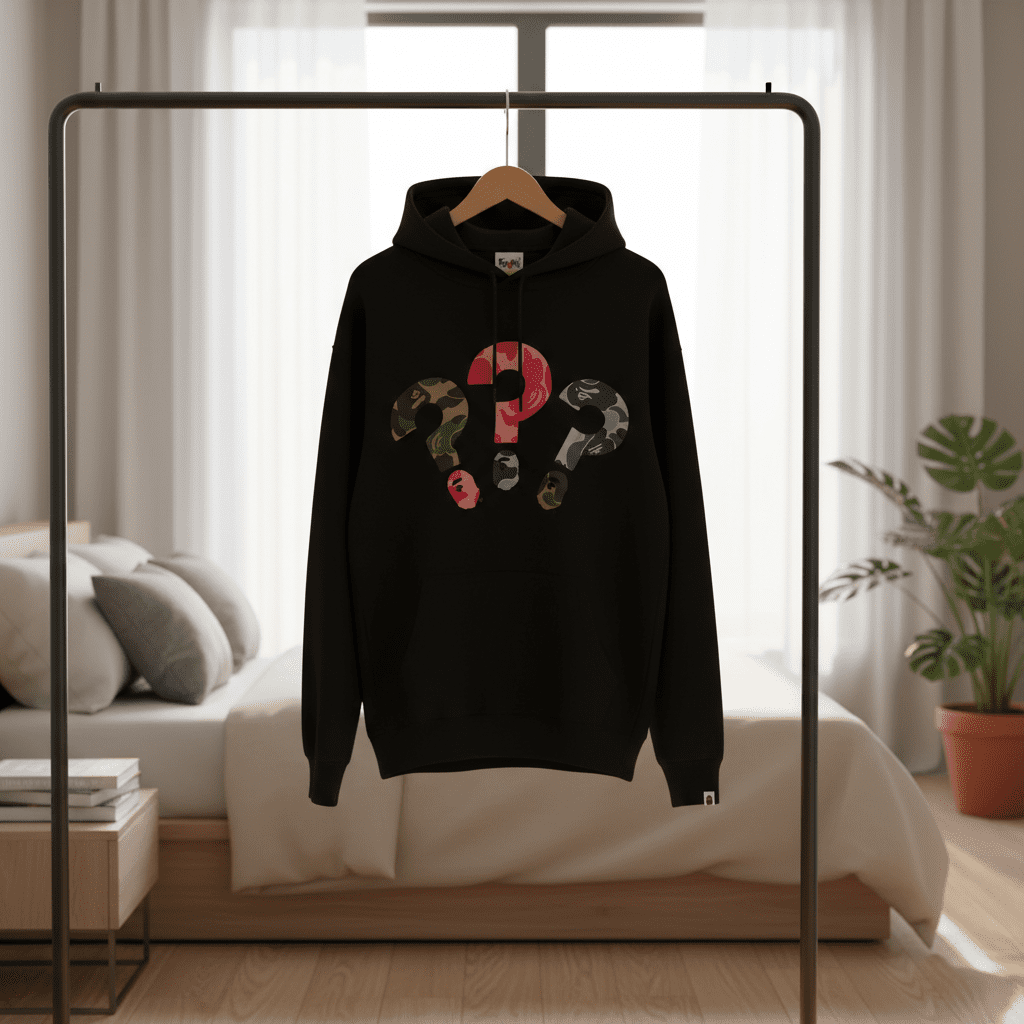 A Bathing Ape black cotton hoodie with green-pink-blue camo question mark graphic featuring ape motif, drawstring hood, kangaroo pocket, streetwear style, unisex casual wear.