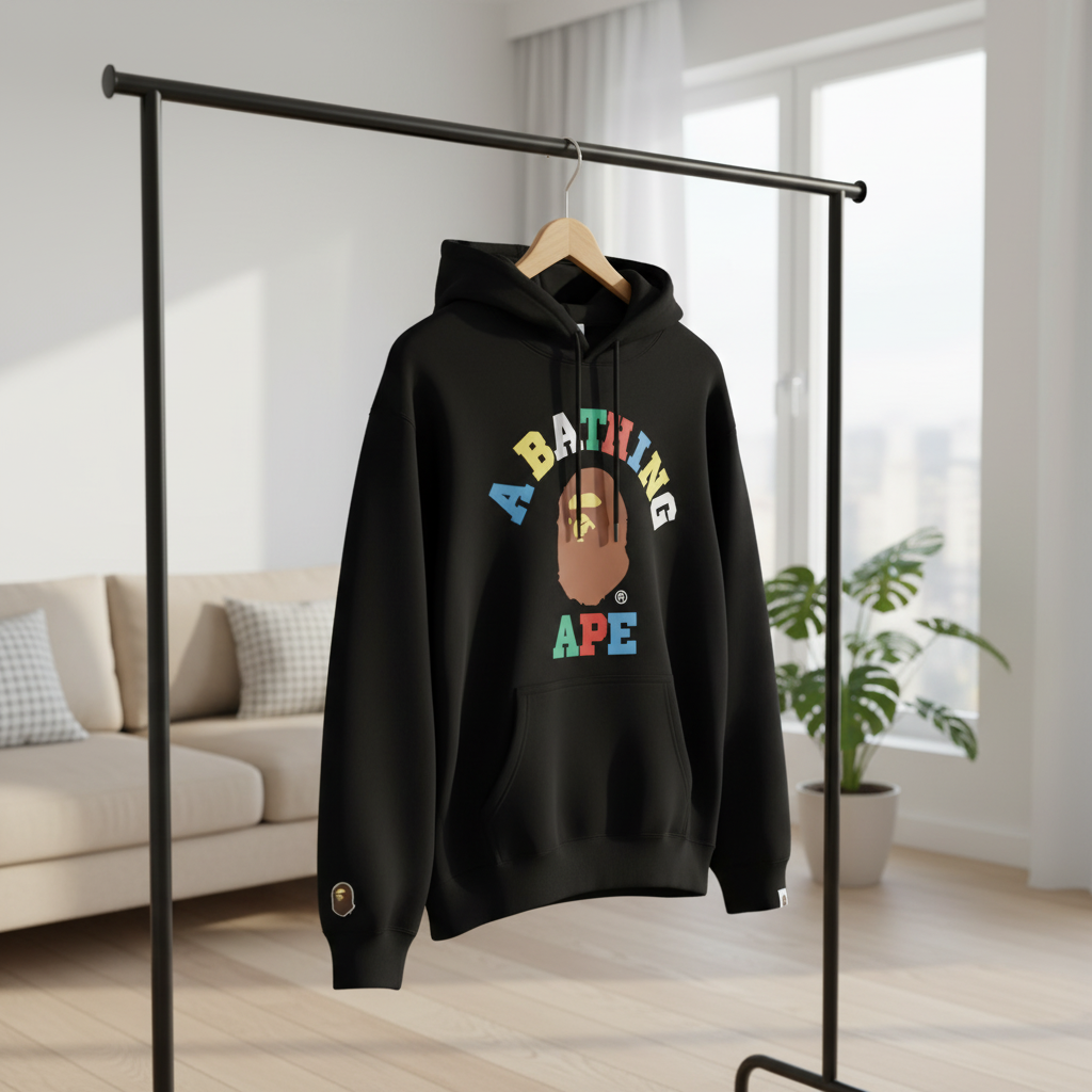 A Bathing Ape BAPE black hoodie with colorful ape head and rainbow logo, soft cotton fabric, drawstring hood, kangaroo pocket, unisex streetwear style for daily comfort and warmth.