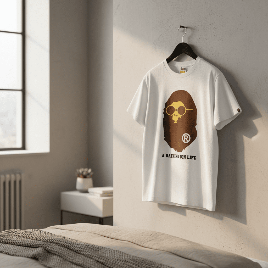 BAPE A Bathing Ape white cotton T-shirt featuring iconic brown ape head with yellow round sunglasses and “A BATHING DON LIFE” print, soft breathable fabric, unisex street style for daily wear.