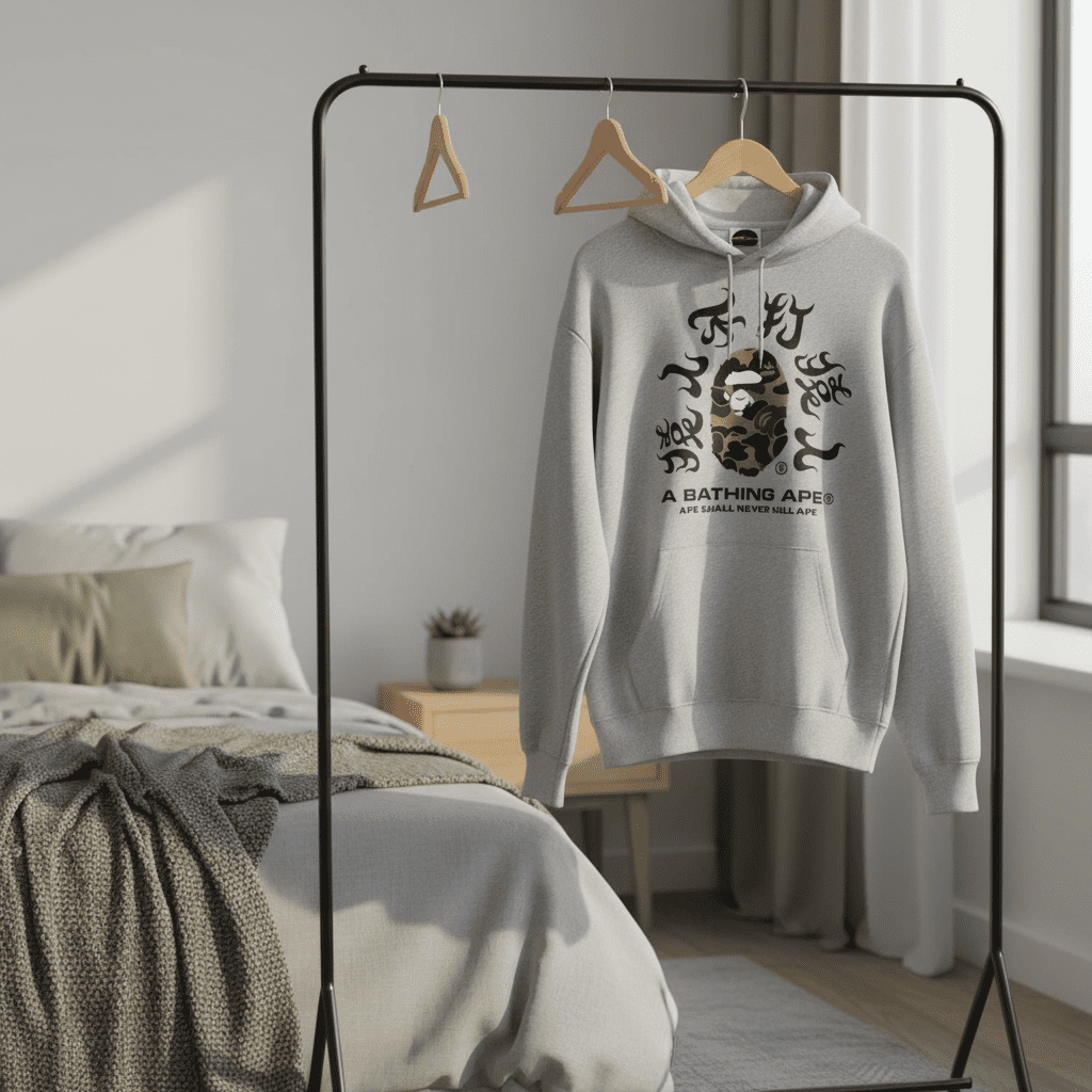 A Bathing Ape grey cotton hoodie with soft breathable fabric, featuring camo ape head and Chinese character print, streetwear unisex design, warm and stylish for daily casual wear.