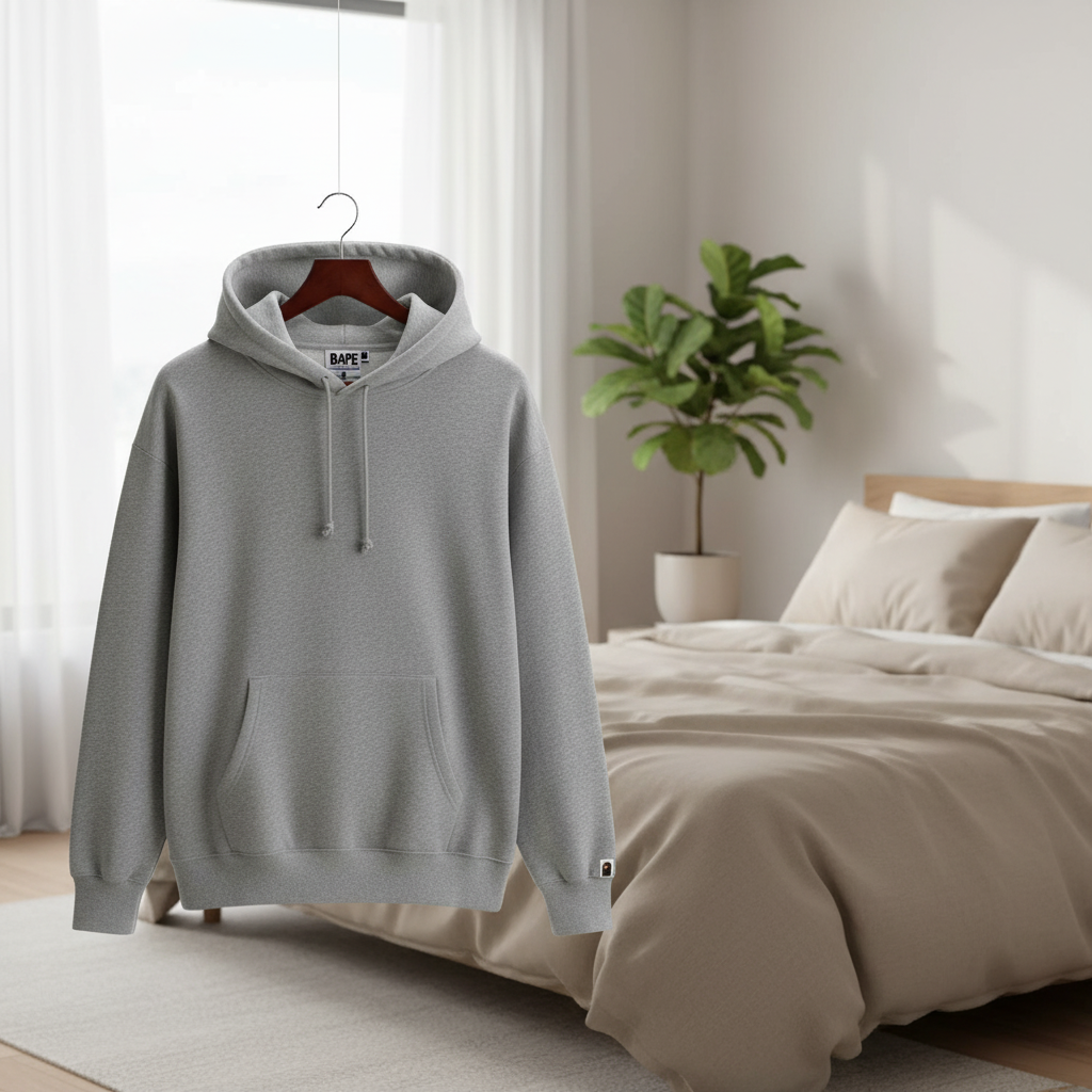 A Bathing Ape BAPE gray hoodie made of premium soft cotton, featuring blue camo ape head graphic with artistic text, classic warm hood design, unisex streetwear style for daily fashionable outfits.