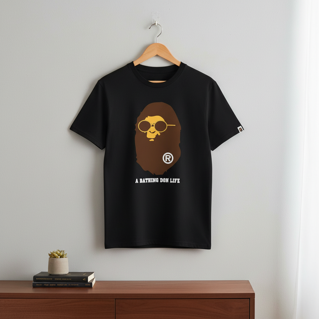 A Bathing Ape black cotton T-shirt featuring classic ape head with golden glasses and white “A BATHING DON LIFE” print, logo tag on sleeve, breathable and unisex streetwear style.