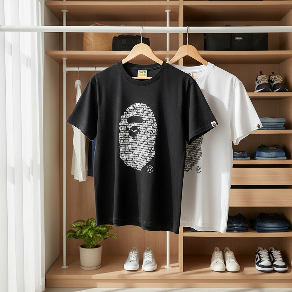 A Bathing Ape black short-sleeve T-shirt, made of premium soft breathable cotton, featuring the iconic letter-filled Ape Head print, streetwear style for men and women, trendy and versatile everyday wear.