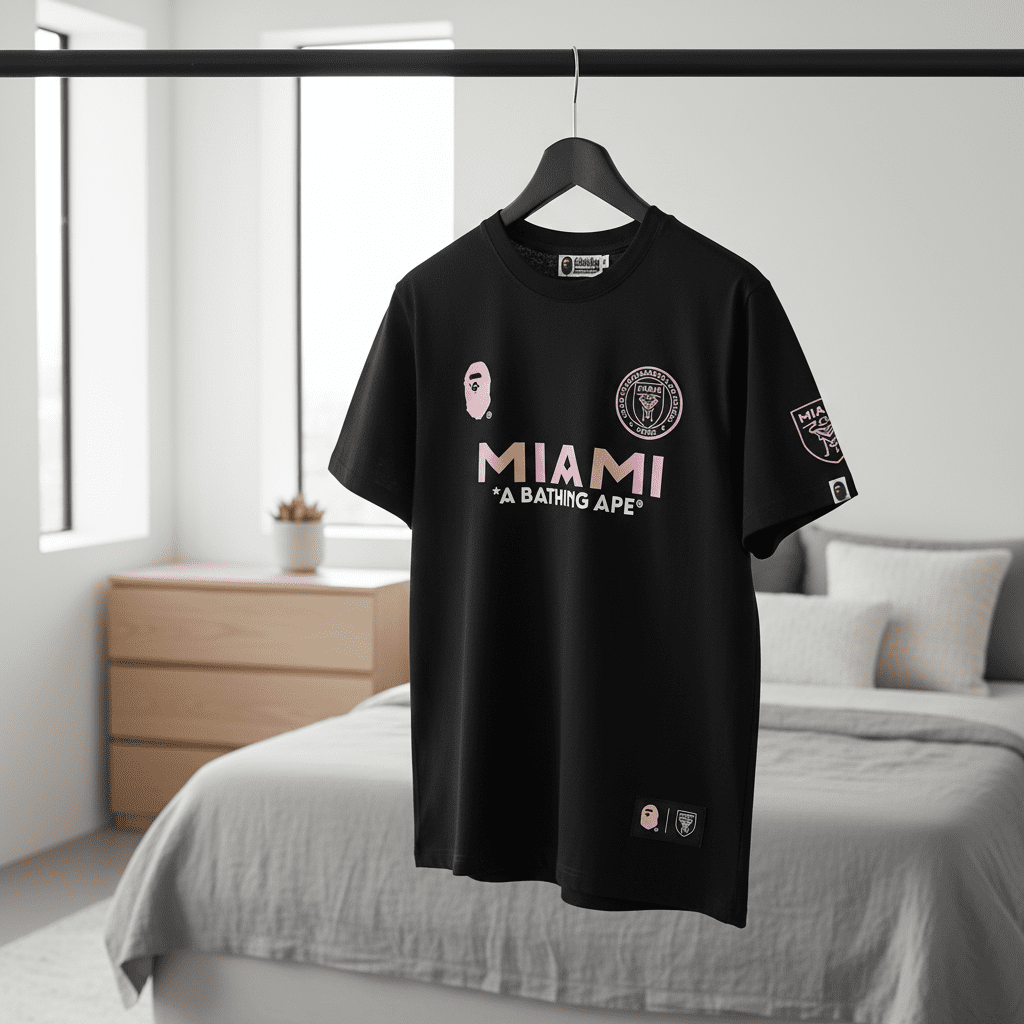 A Bathing Ape MIAMI Black Cotton T-Shirt with Pink Ape Head and MIAMI Logo, round badge and sleeve tag design, breathable unisex streetwear for daily casual style.