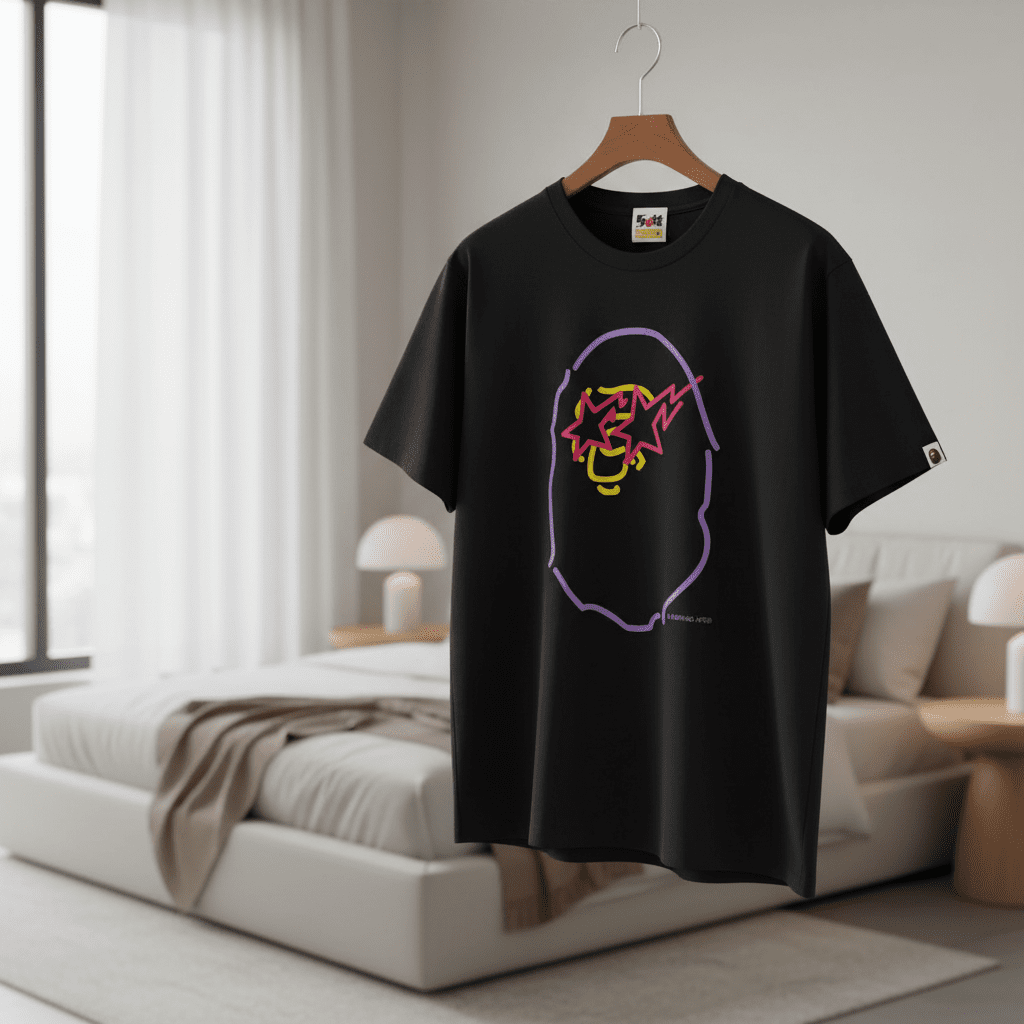 A Bathing Ape black cotton T-shirt featuring purple outline Ape Head with yellow lightning and pink stars print, logo tag on sleeve, street fashion unisex style for daily casual looks.