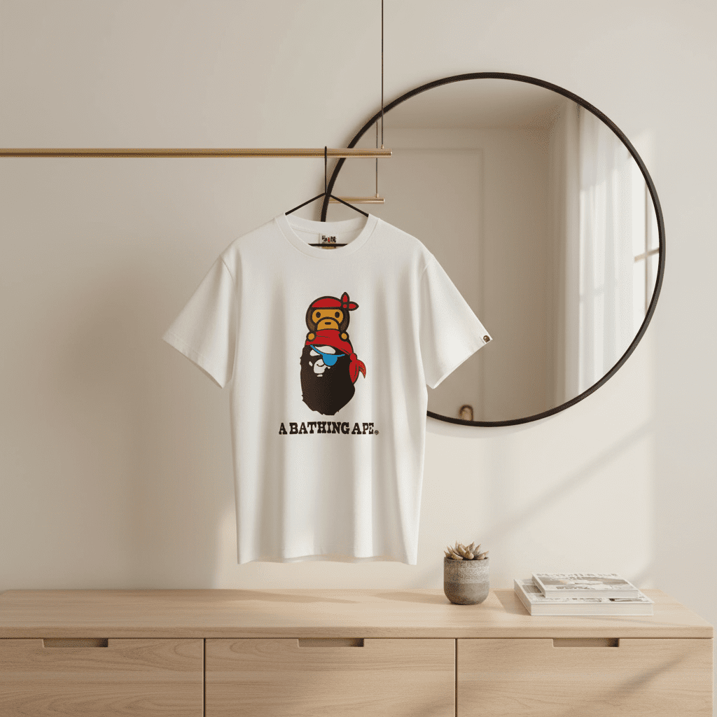 A Bathing Ape Pirate Series White T-Shirt, made of premium breathable cotton, features a bold pirate ape head graphic. Streetwear style, unisex design for comfort and trendy attitude.