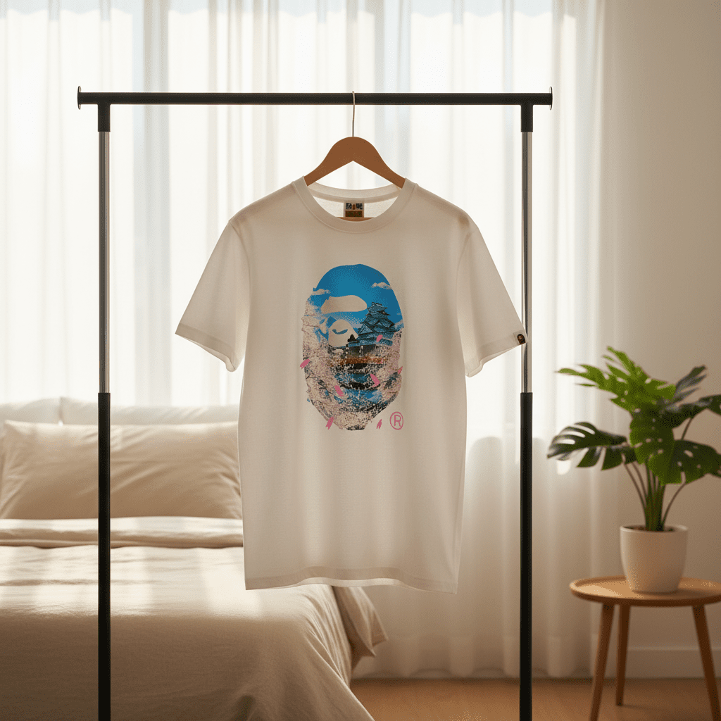 A Bathing Ape classic Ape Head white T-shirt, premium cotton for soft comfort, cherry blossom castle print inside iconic logo, trendy street style, unisex casual wear for everyday fashion.