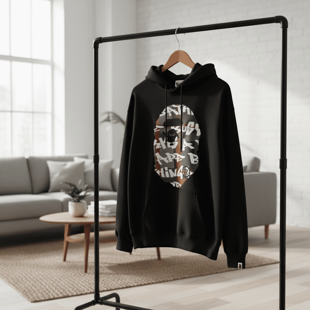 A Bathing Ape Classic Street Hoodie: Crafted from premium cotton for soft and breathable comfort. Features iconic Ape Head graphic with red, black, and white print, adjustable hood, and kangaroo pocket. Unisex.