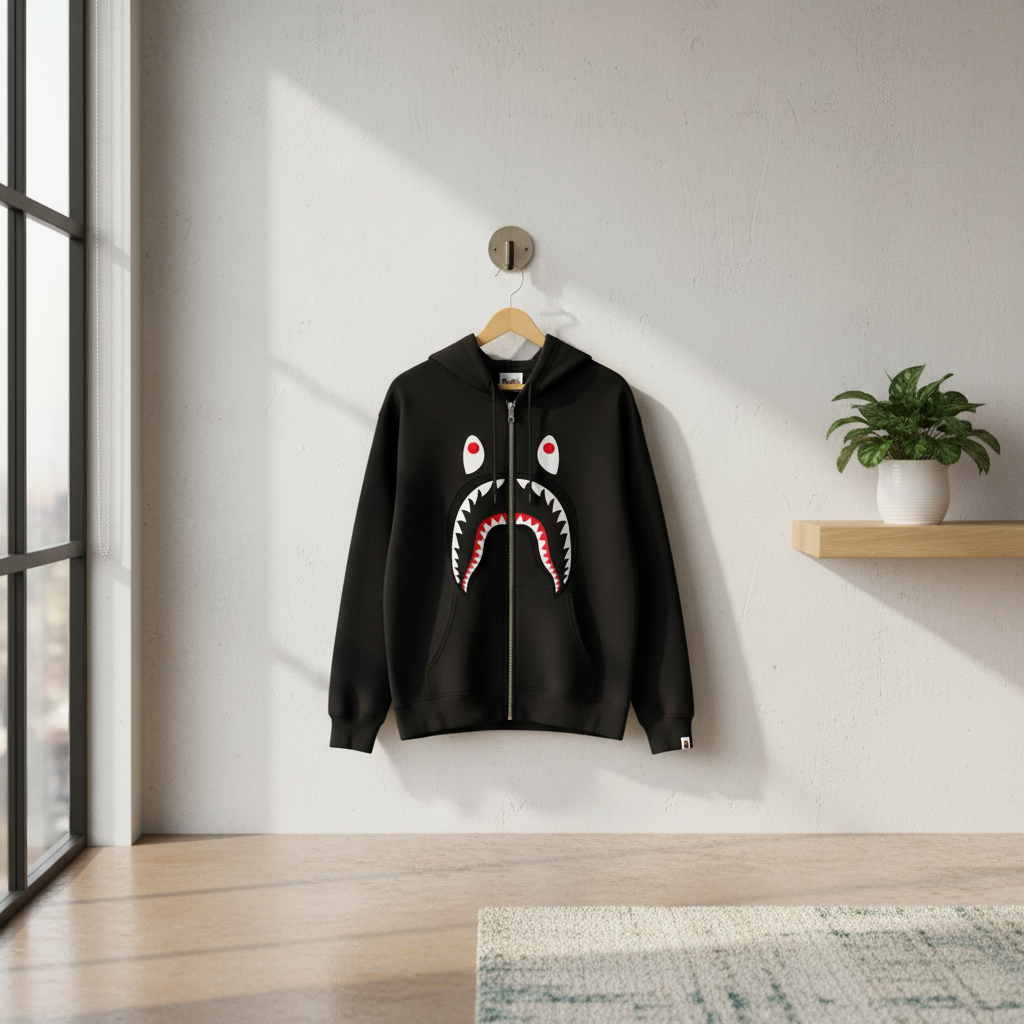 A Bathing Ape Black Shark Zip Hoodie, made from premium soft cotton for warmth and comfort. Features iconic shark mouth design, adjustable drawstring hood, kangaroo pocket, and streetwear unisex style.