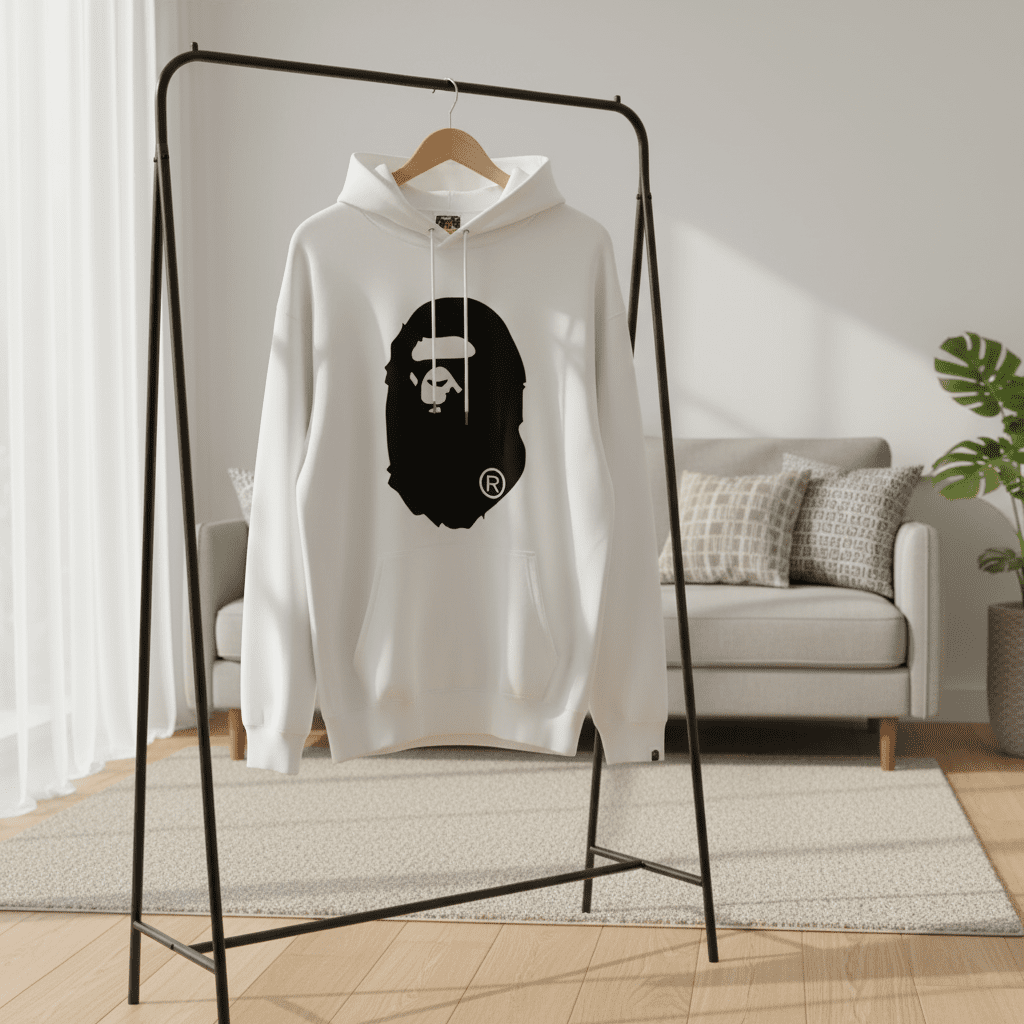 A Bathing Ape classic white hoodie made of premium cotton, features iconic black ape head print, adjustable drawstring hood, front kangaroo pocket, unisex streetwear for casual style.