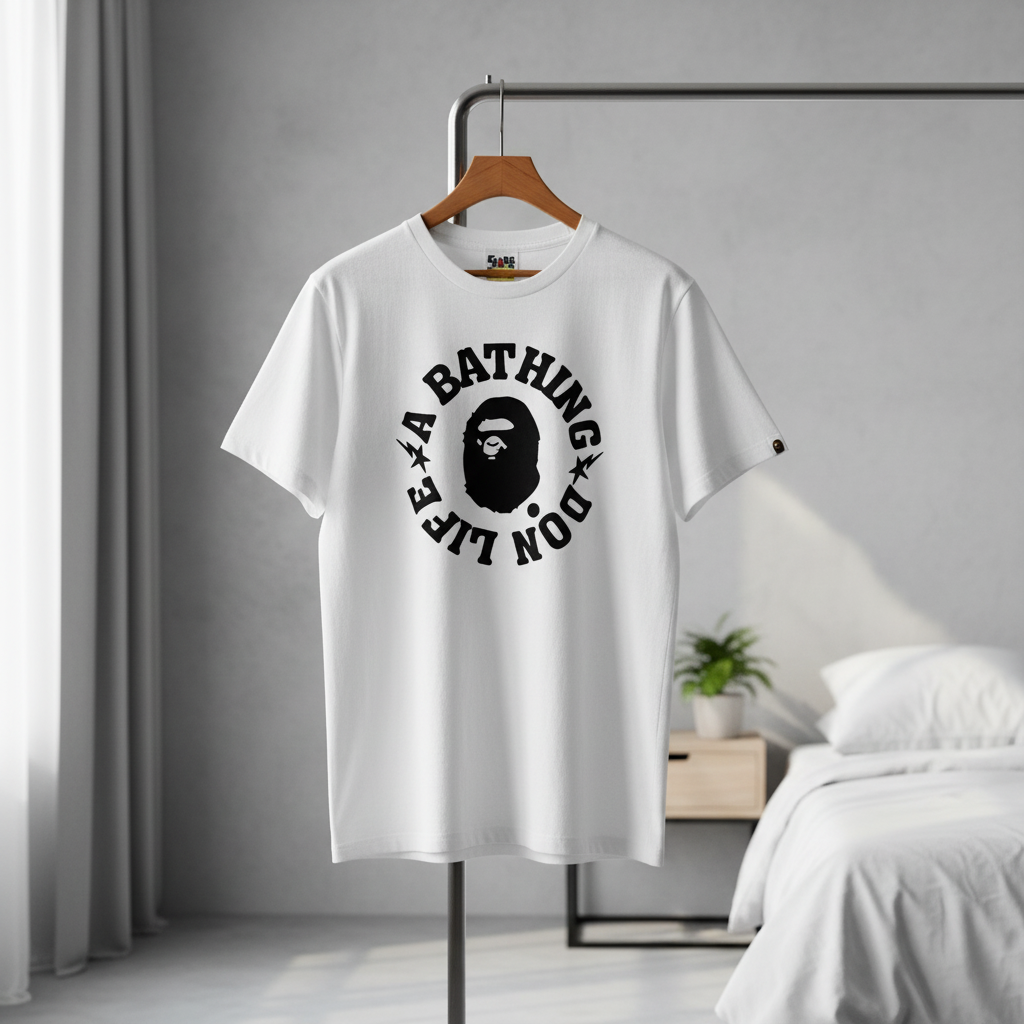 A Bathing Ape white cotton T-shirt featuring the iconic Ape Head logo and circular text print. Unisex streetwear design, soft breathable fabric for a stylish and comfortable look.