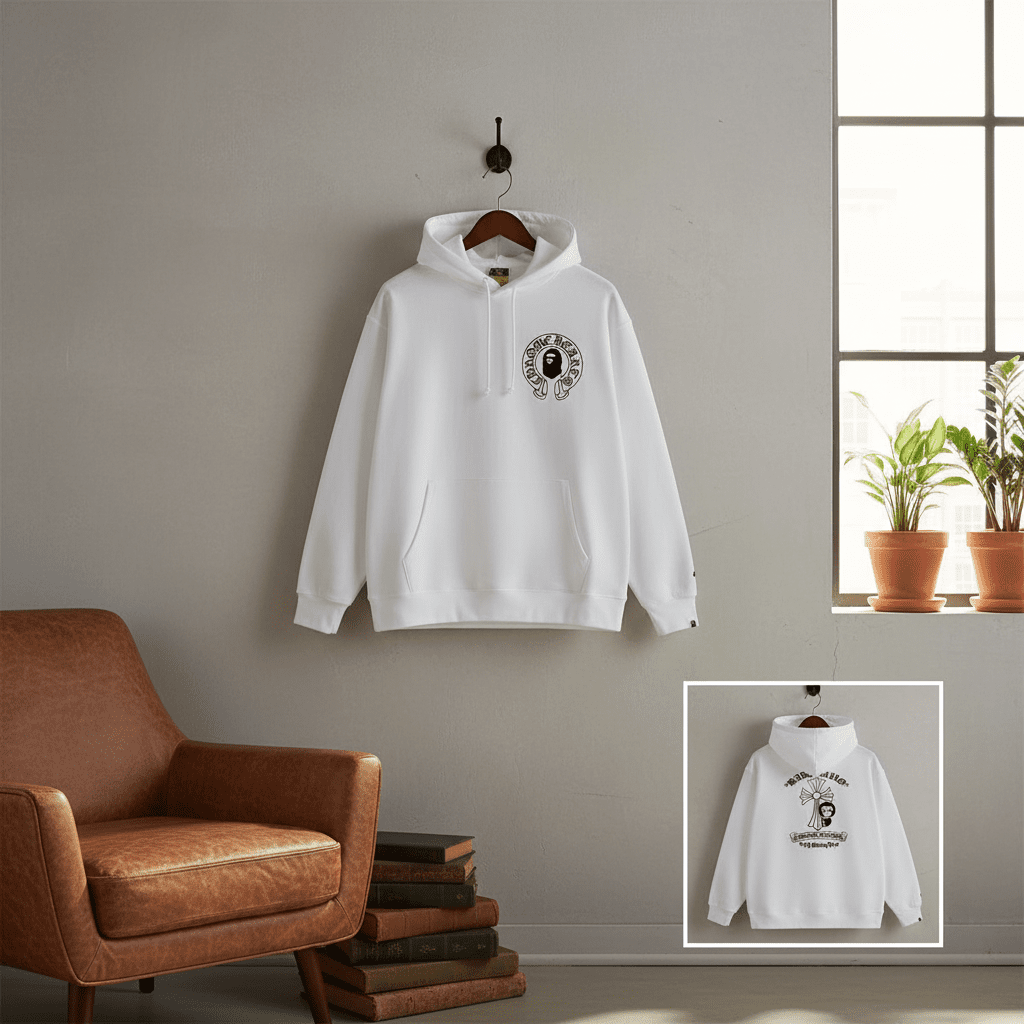 A Bathing Ape x Chrome Hearts white hoodie, soft breathable cotton, front and back logo prints, drawstring hood, kangaroo pocket, unisex streetwear style, casual warm and stylish.