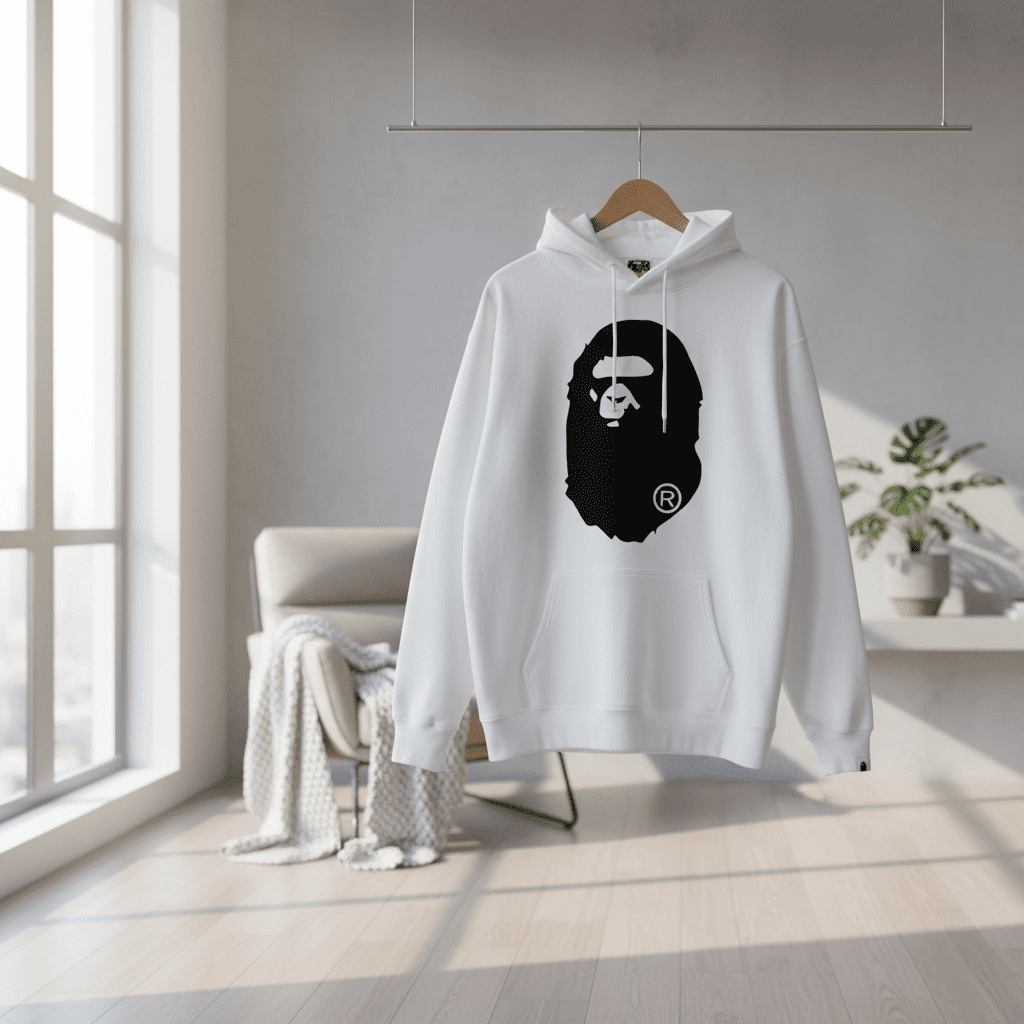 A Bathing Ape White Hoodie features premium soft breathable cotton, iconic black ape head logo, adjustable drawstring hood, front kangaroo pocket, unisex streetwear style for bold fashion.