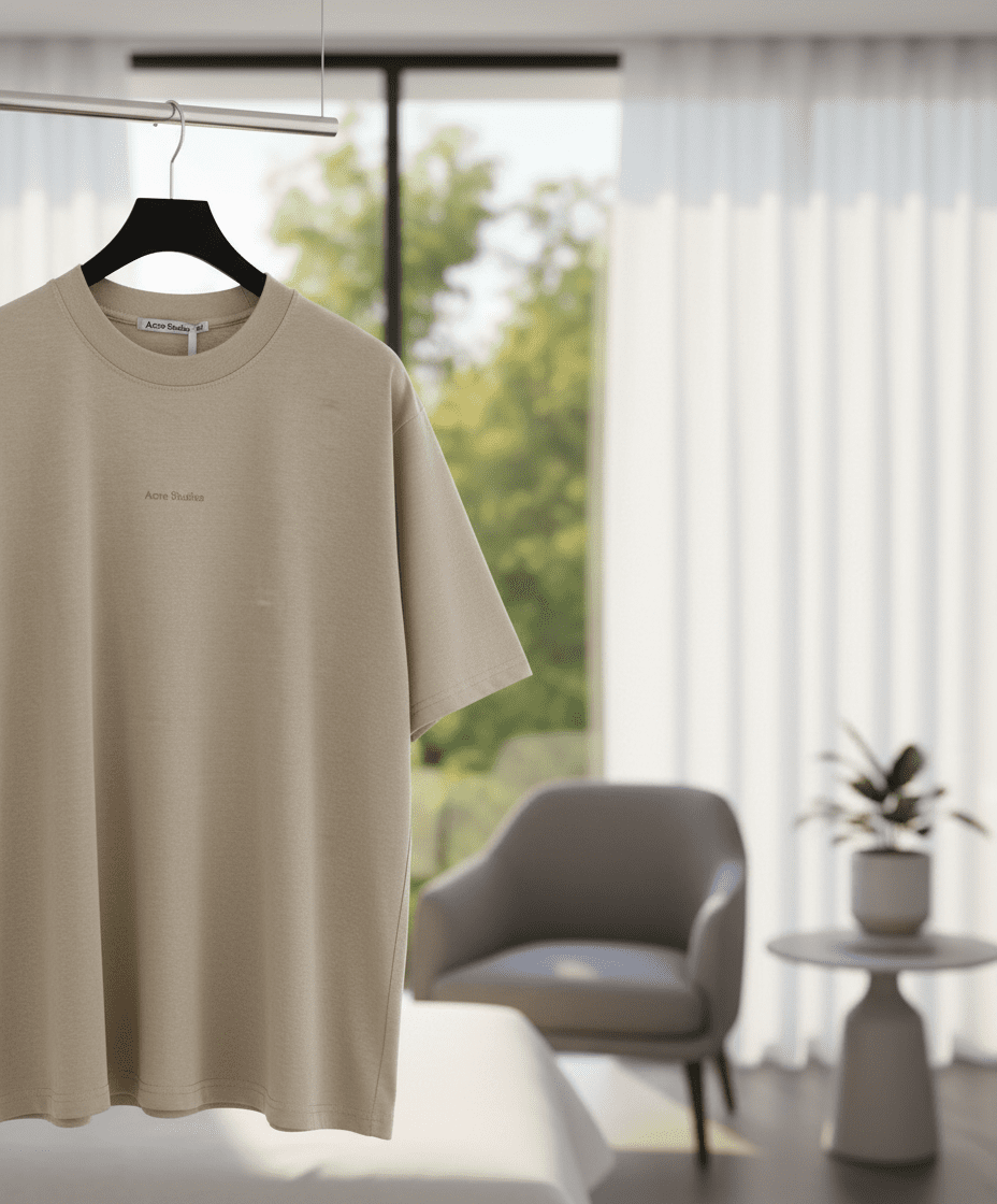 Acne Studios Light Khaki Cotton T-Shirt, minimalist Nordic design with crew neck and chest logo, unisex modern fit, breathable and soft for everyday casual wear.