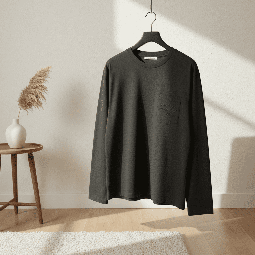 Acne Studios Classic Black Cotton Long Sleeve T-Shirt with Chest Pocket Embroidery Logo and 1996 Motif, Unisex Minimalist Nordic Style, Breathable and Versatile Everyday Basic Top.