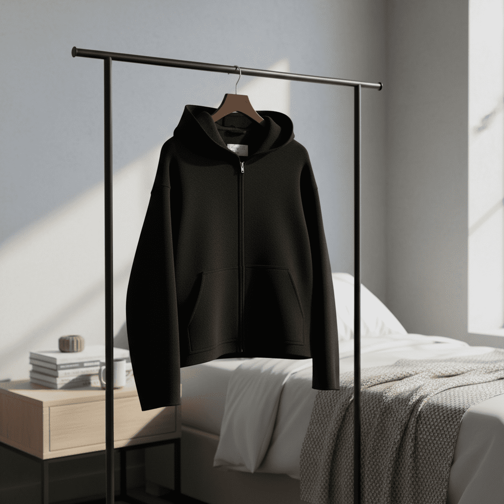 Acne Studios Black Hoodie Zip Jacket – soft and comfy fabric, minimalist Nordic design, practical kangaroo pocket, unisex casual wear, modern simplicity meets timeless Scandinavian style.