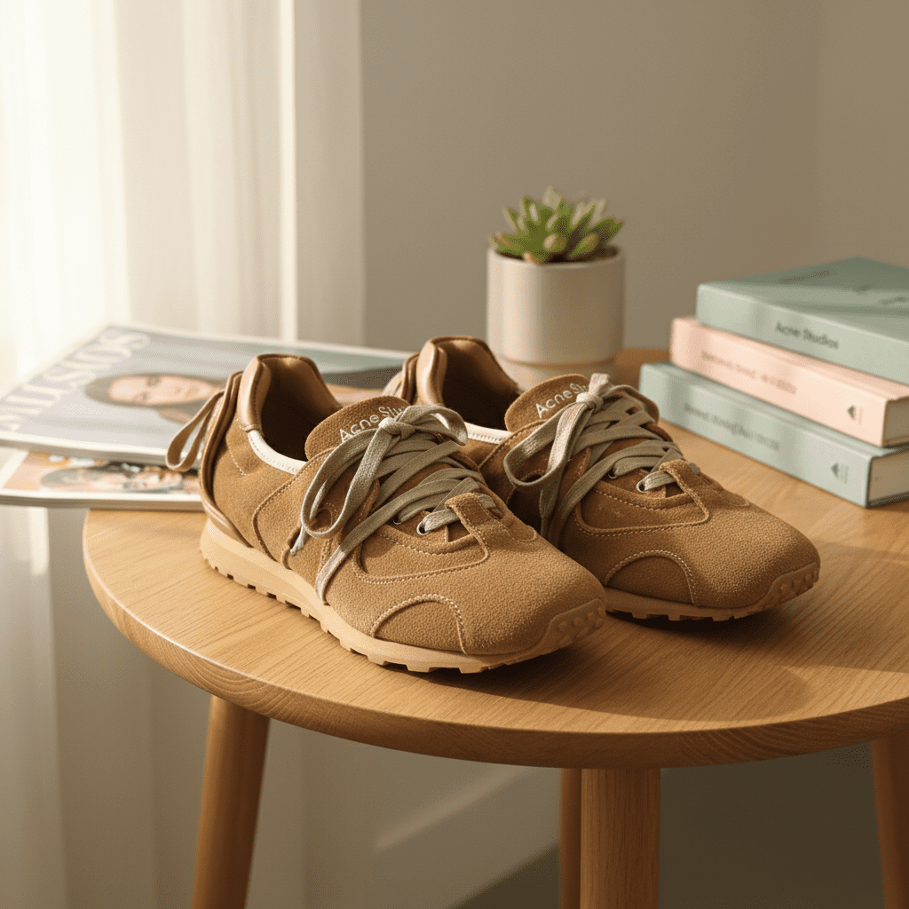 Acne Studios Brown Suede Sneakers crafted from soft premium suede, featuring white logo detail, Scandinavian minimalist design, adjustable laces, unisex style for casual comfort and modern fashion.