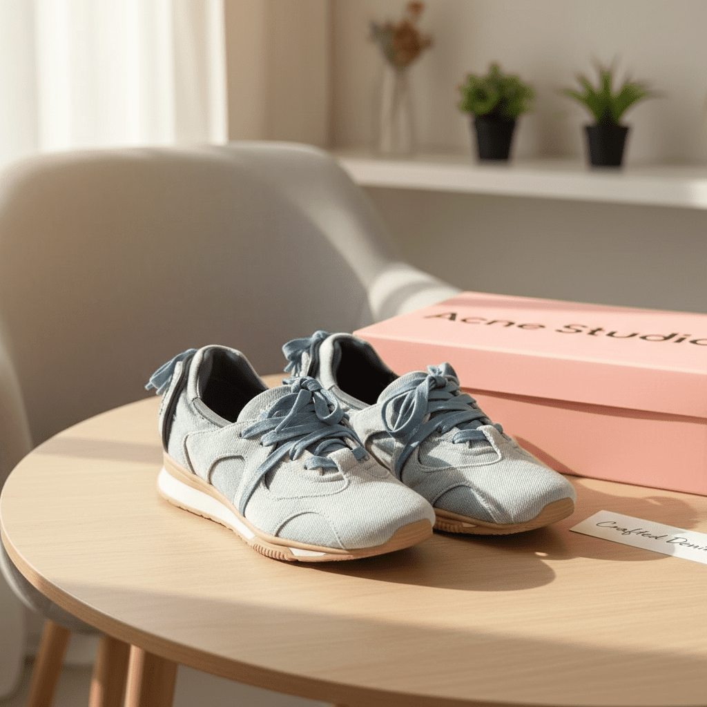 Acne Studios Light Blue Sneakers crafted from washed fabric with minimalist lace-up design, Nordic style, unisex, branded tongue detail, breathable and comfy for everyday casual wear.