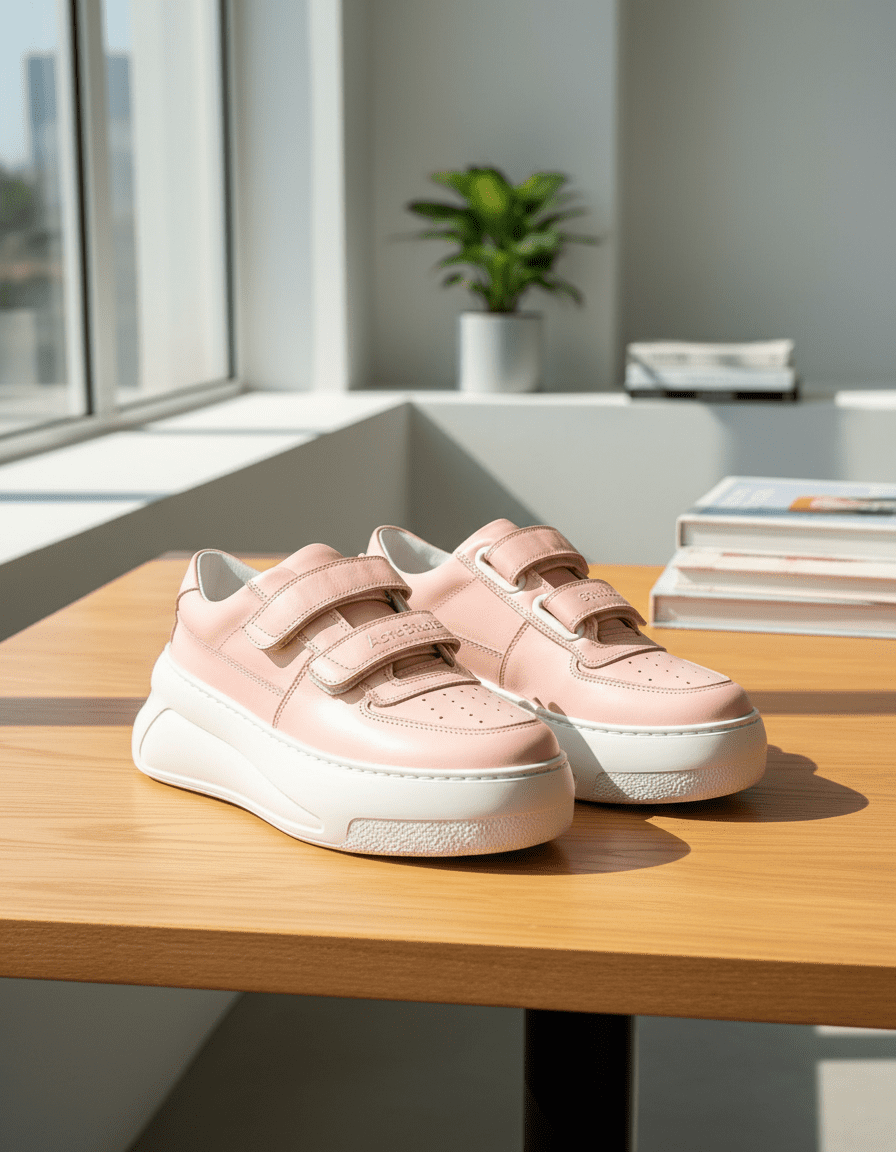 Acne Studios Pink Platform Sneakers feature premium leather, easy Velcro closure, trendy thick sole for height boost, breathable comfort and chic style perfect for everyday casual wear.