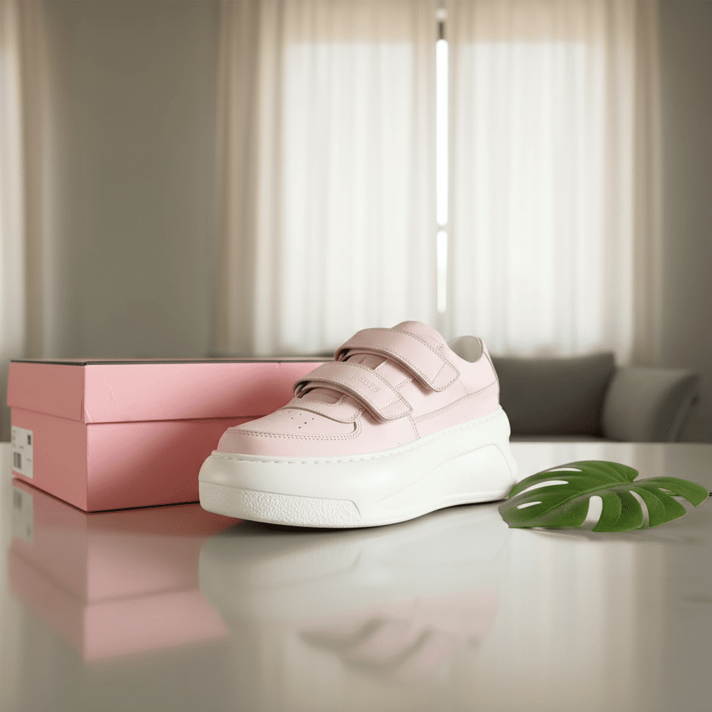 Acne Studios Pink Platform Sneakers feature premium leather upper and velcro straps, offering comfort and modern style. Unisex design perfect for casual daily wear and trendy fashion looks.
