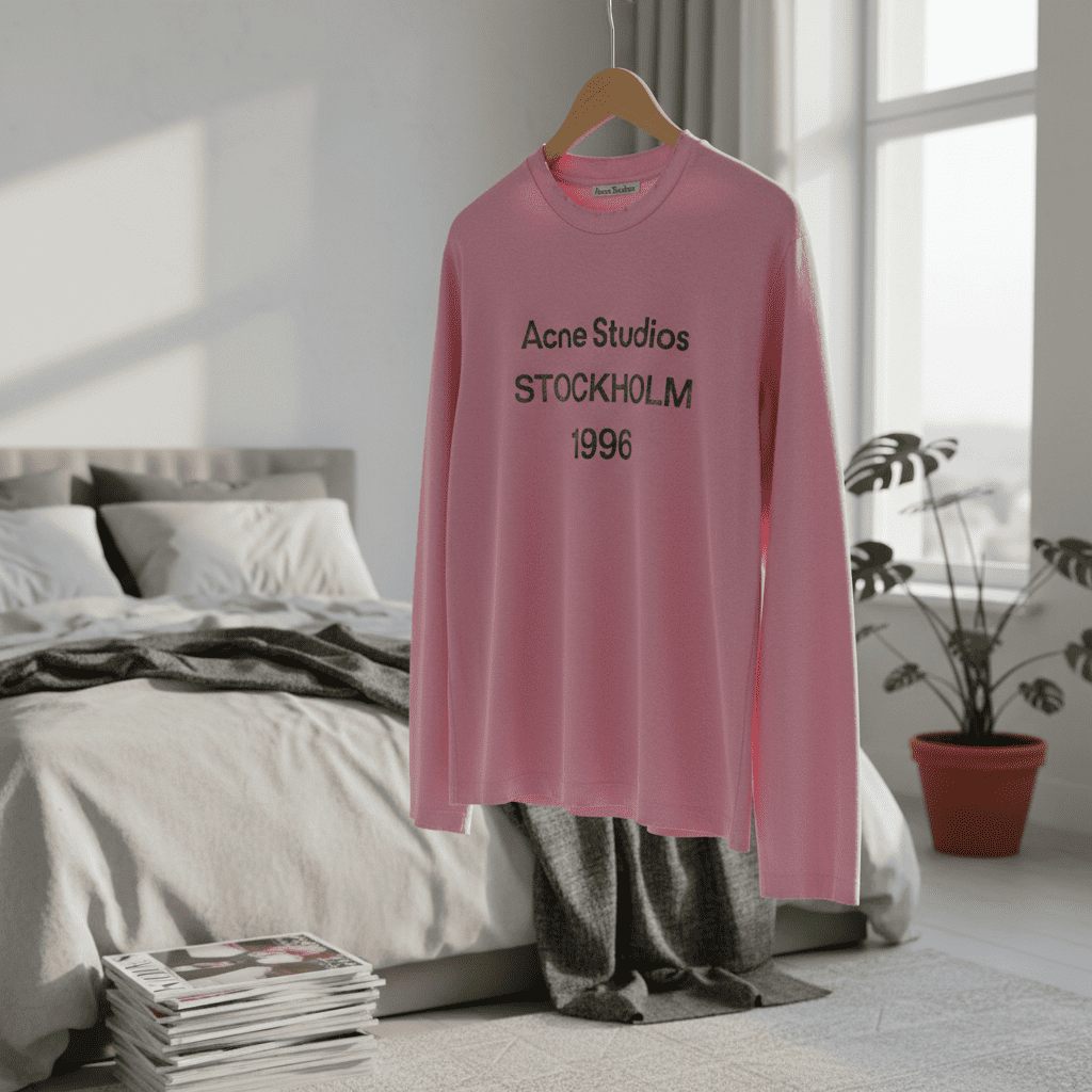 Acne Studios Pink Long Sleeve T-Shirt, soft cotton comfort, minimalist Nordic unisex design, iconic logo graphic, inspired by 1996 classic style, perfect for everyday fashionable wear.