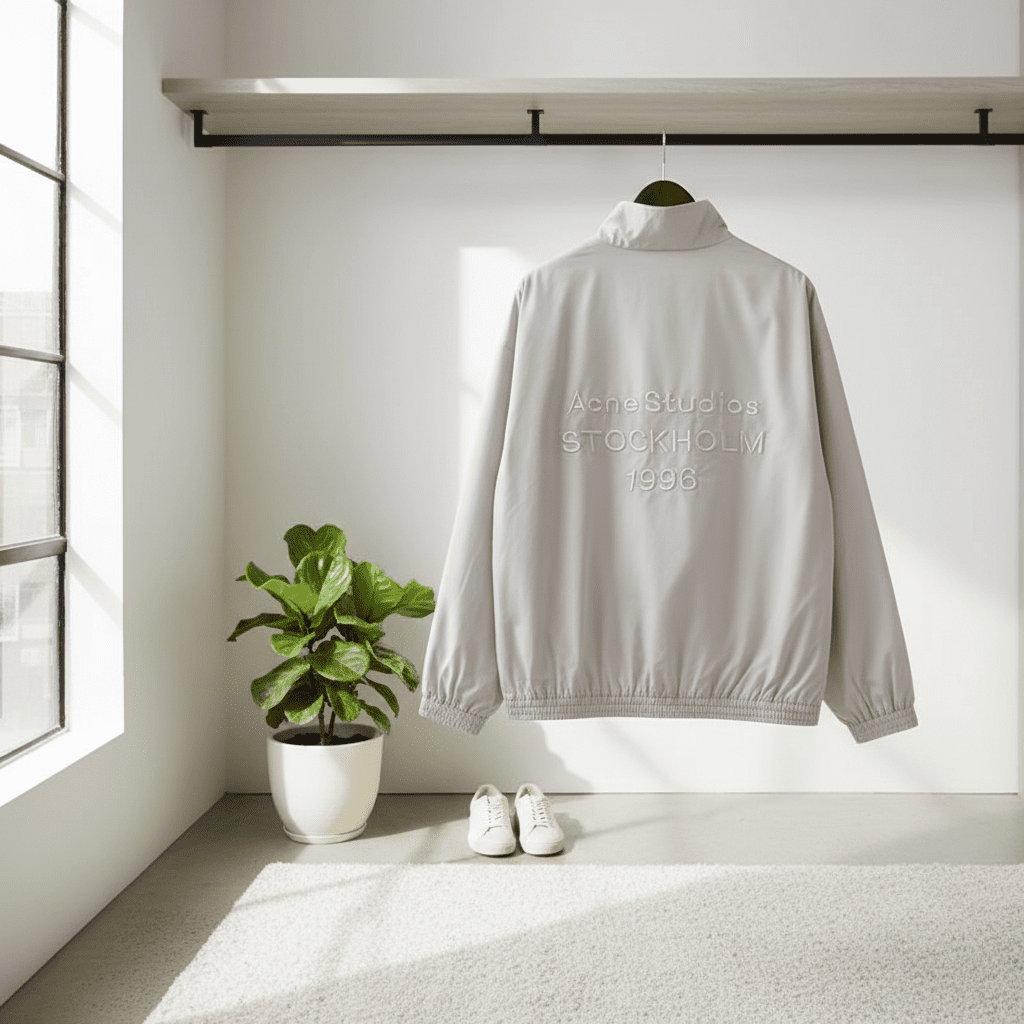 Acne Studios Stockholm 1996 Light Gray Windbreaker Jacket, lightweight durable fabric, stand collar with drawstring, embossed back logo, unisex minimal Nordic style for effortless modern fashion.