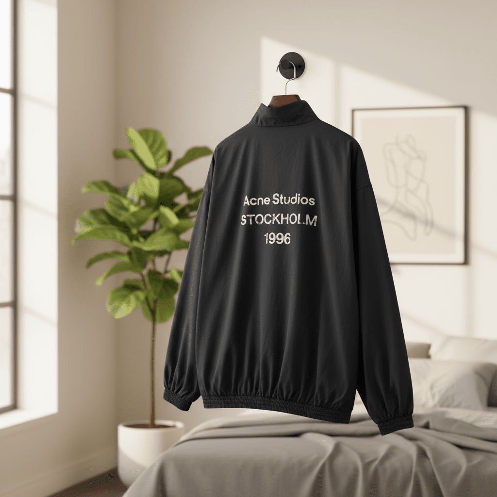Acne Studios Black Windbreaker Jacket, polyester fabric with stand collar, bold “STOCKHOLM 1996” print on back, Nordic minimalist design, unisex, stylish and lightweight windproof outerwear.