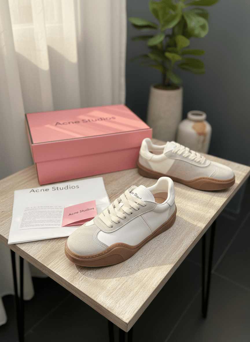 Acne Studios white-grey sneakers blend leather and suede with Nordic minimalism, gum sole for grip and durability, unisex design, perfect for everyday casual comfort and timeless style.