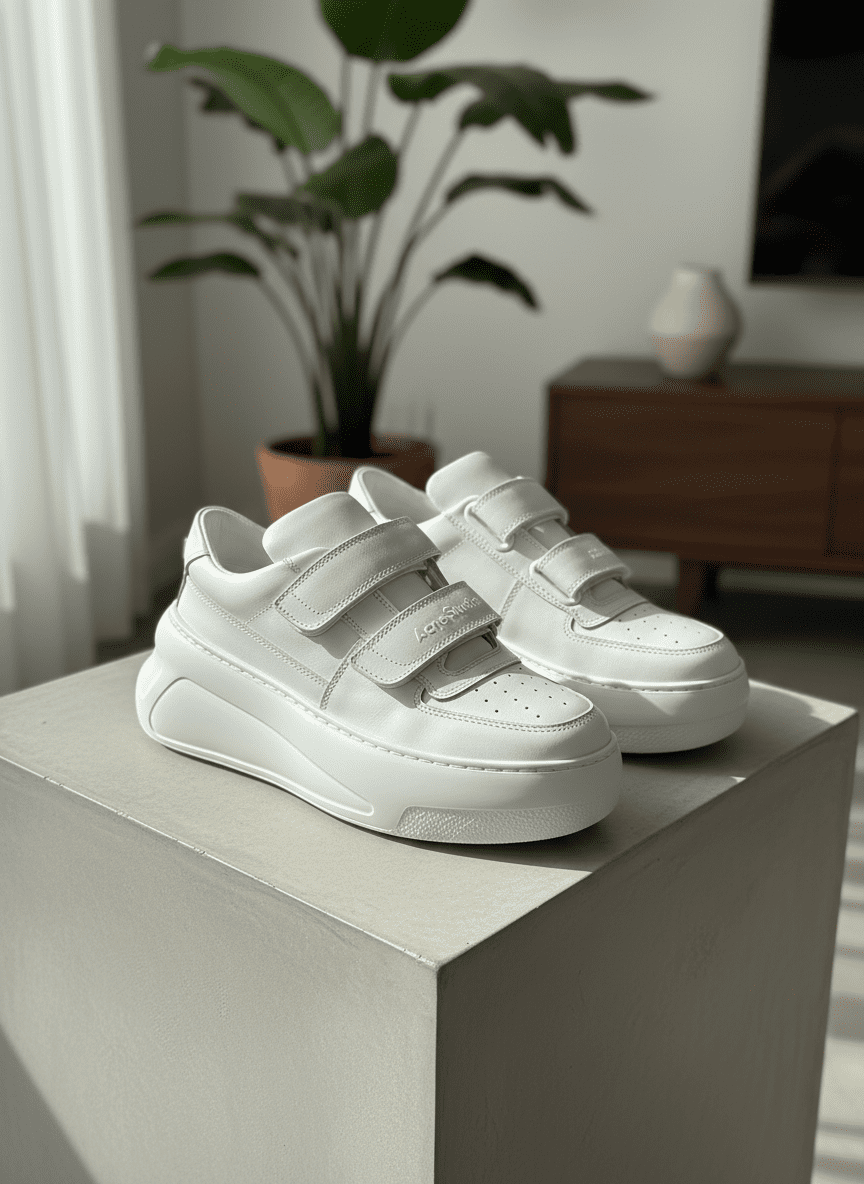 Acne Studios white leather platform sneakers feature premium materials, double Velcro straps for easy wear, breathable perforated toe, unisex Nordic minimalist design, stylish and versatile for daily fashion.