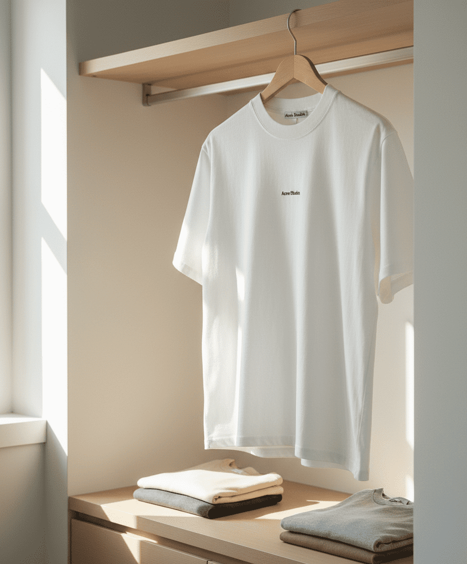 Acne Studios white cotton T-shirt, soft and breathable with minimalist logo on chest, unisex design, Nordic minimalist style, perfect for casual daily wear and easy matching.