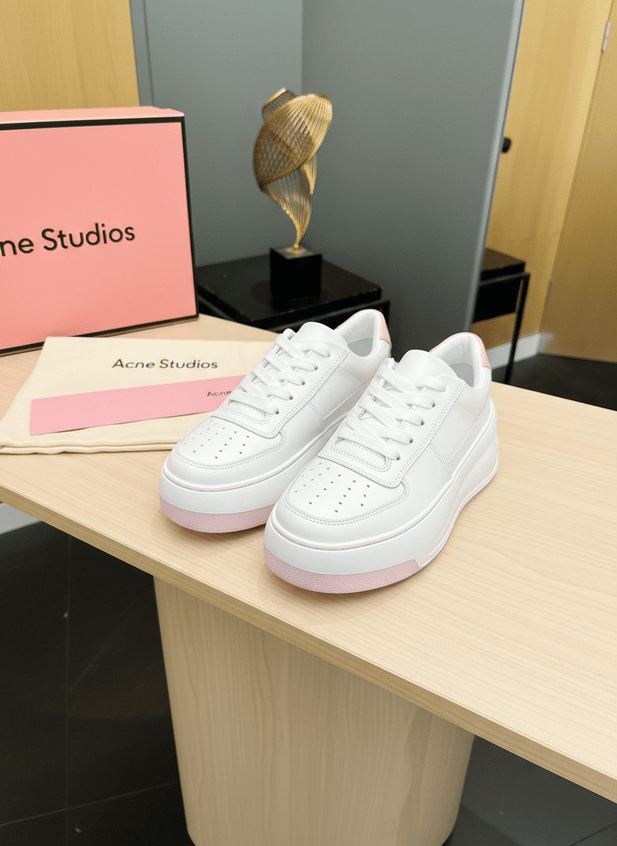 Acne Studios white platform sneakers, crafted from premium leather with pink accents on toe and heel, feature a sleek Nordic design, breathable comfort, unisex fit, and height-enhancing sole.