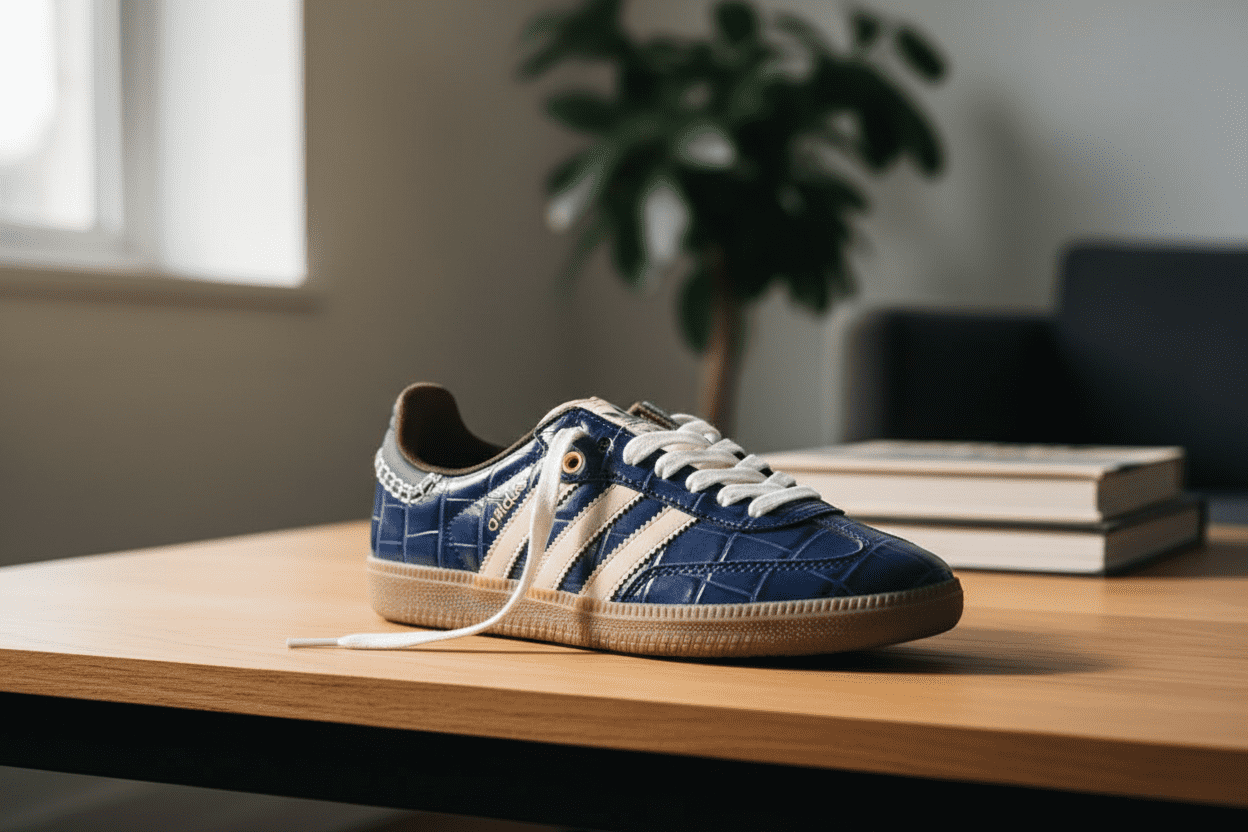 Adidas Retro Blue Sneakers crafted from premium leather with crocodile texture, featuring classic three stripes, comfy sole, unisex design, blending vintage charm with modern street style.