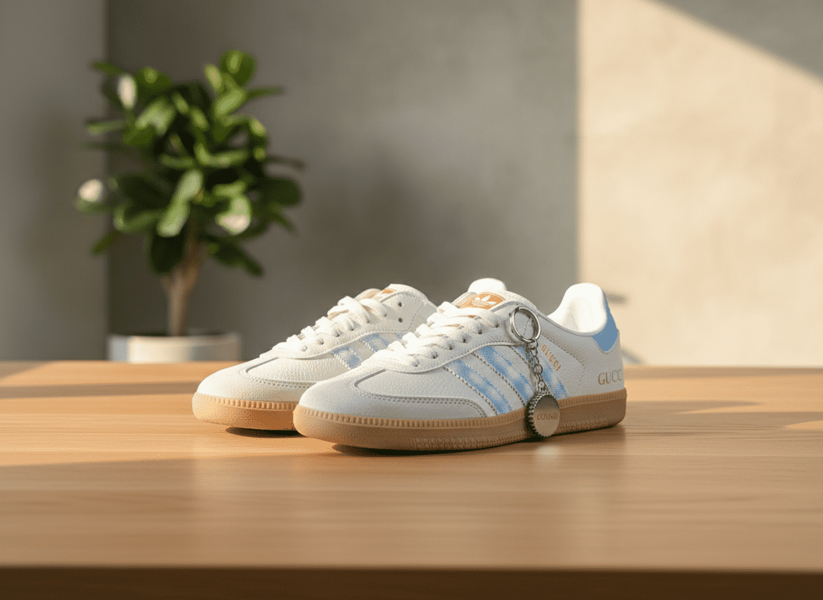 Adidas Samba Light Blue White Sneakers – premium leather, classic three stripes, retro sporty style, unisex design, stylish yet comfortable, perfect for everyday wear and easy outfit matching.