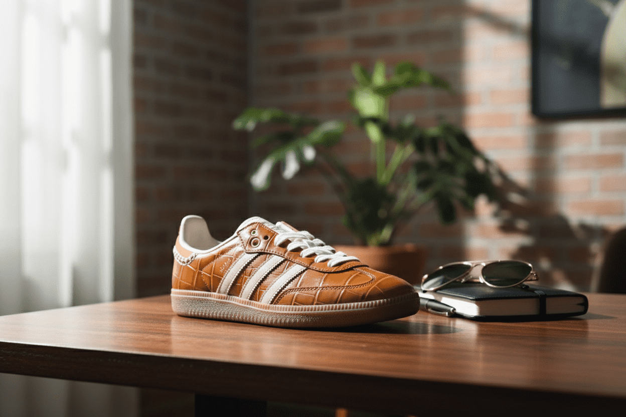Adidas Brown Casual Shoes featuring premium leather, crocodile texture, and classic three stripes. Retro unisex design, stylish, durable, and comfortable for everyday wear.