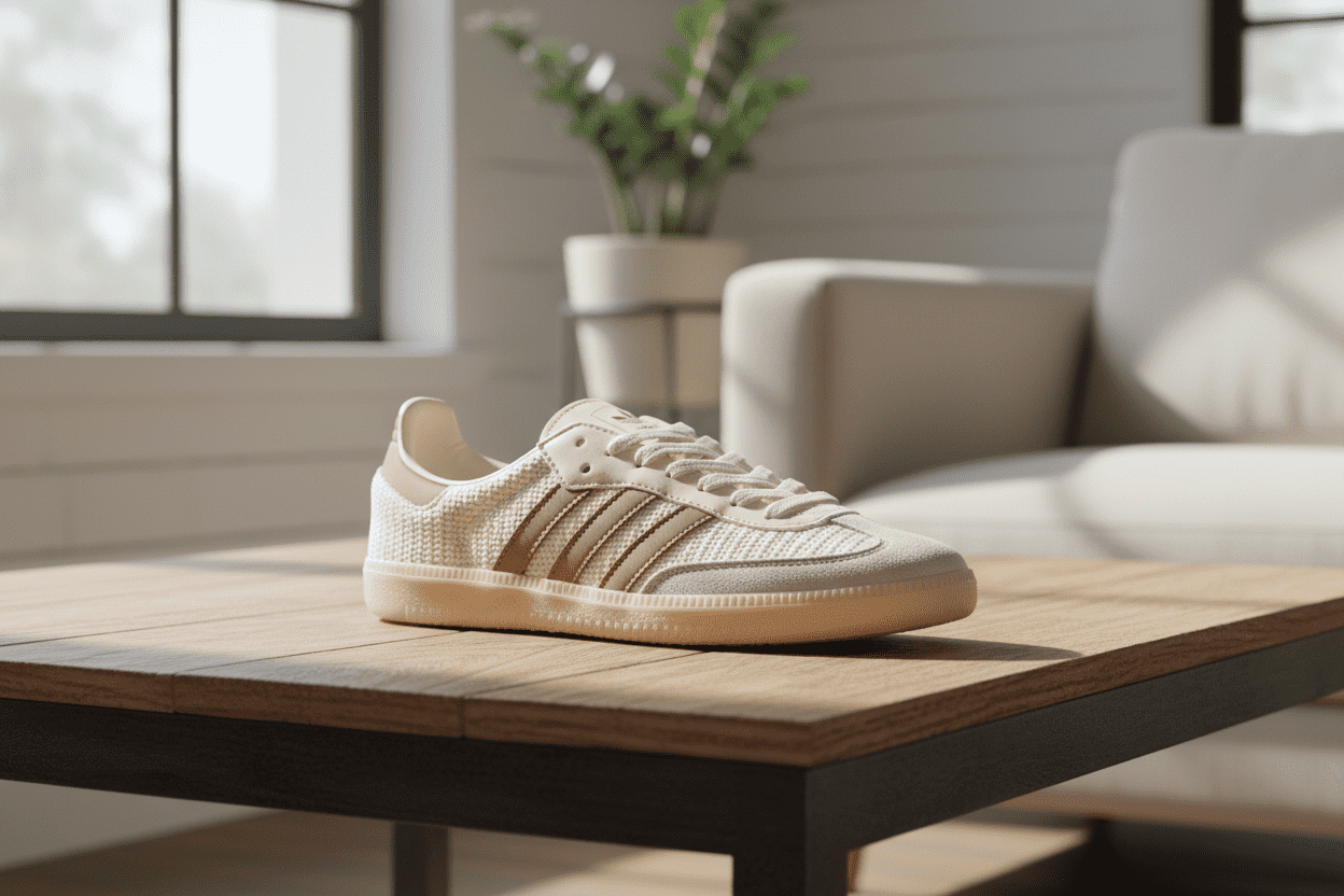 Adidas Retro Casual Series Off-White and Light Brown Breathable Sneakers, mesh and leather blend, iconic three-stripe design, durable, unisex, stylish and versatile for everyday wear.