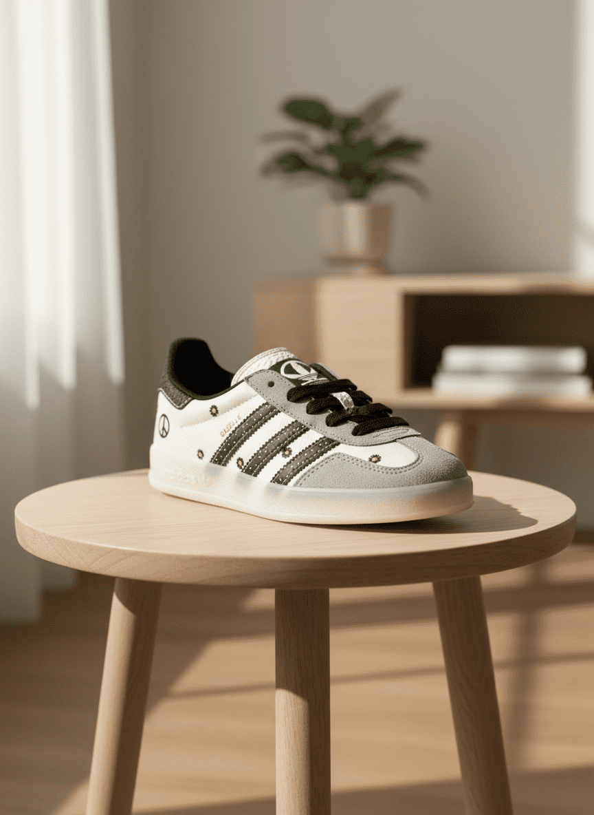 Adidas Gazelle White Grey retro sneakers feature comfy material, classic three stripes, floral and peace motifs, unisex design, stylish and functional for everyday wear.