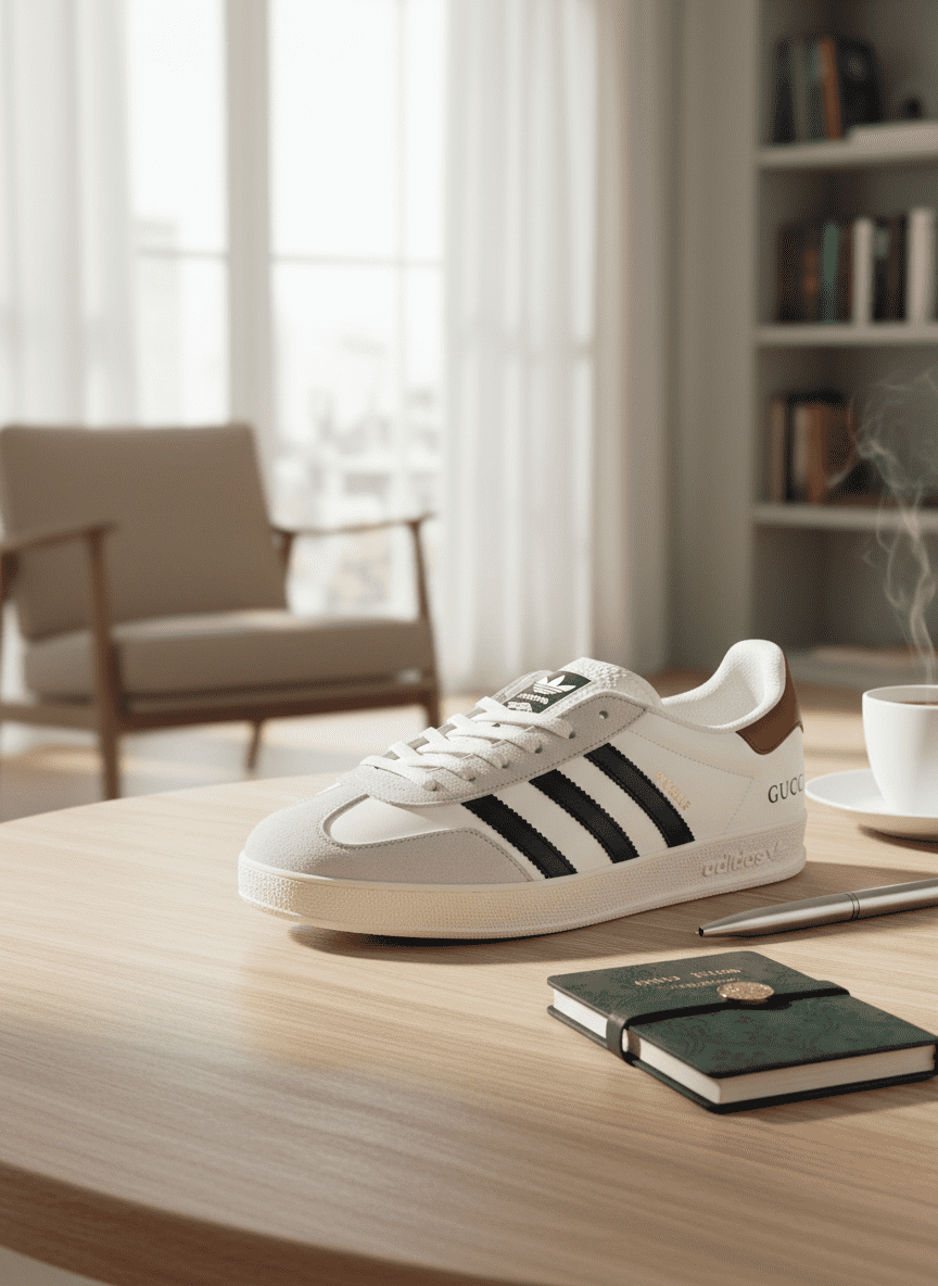 Adidas Gazelle Sneakers feature white, blue, and red colors, premium leather, classic three-stripe design with Gucci-inspired details, offering vintage style and comfort for men and women.