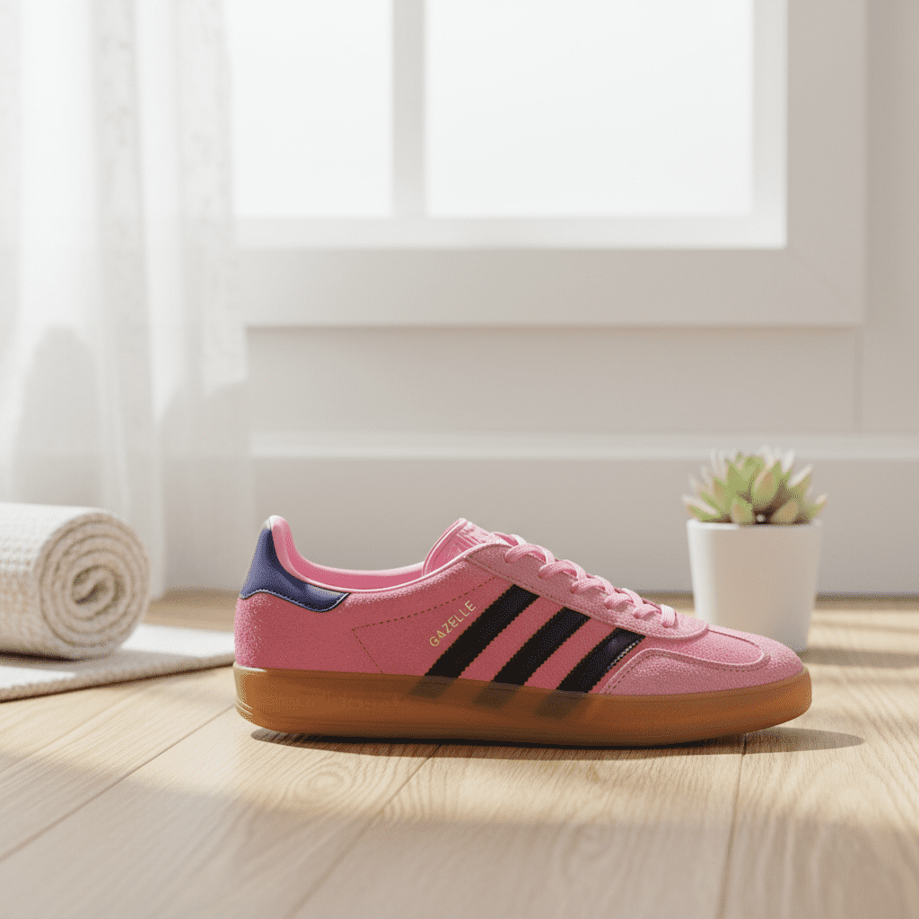 Adidas Gazelle Pink Suede Sneakers feature black three stripes, purple heel tab, and a translucent gum sole. Unisex, breathable, and stylish—perfect for casual wear with a vintage touch.