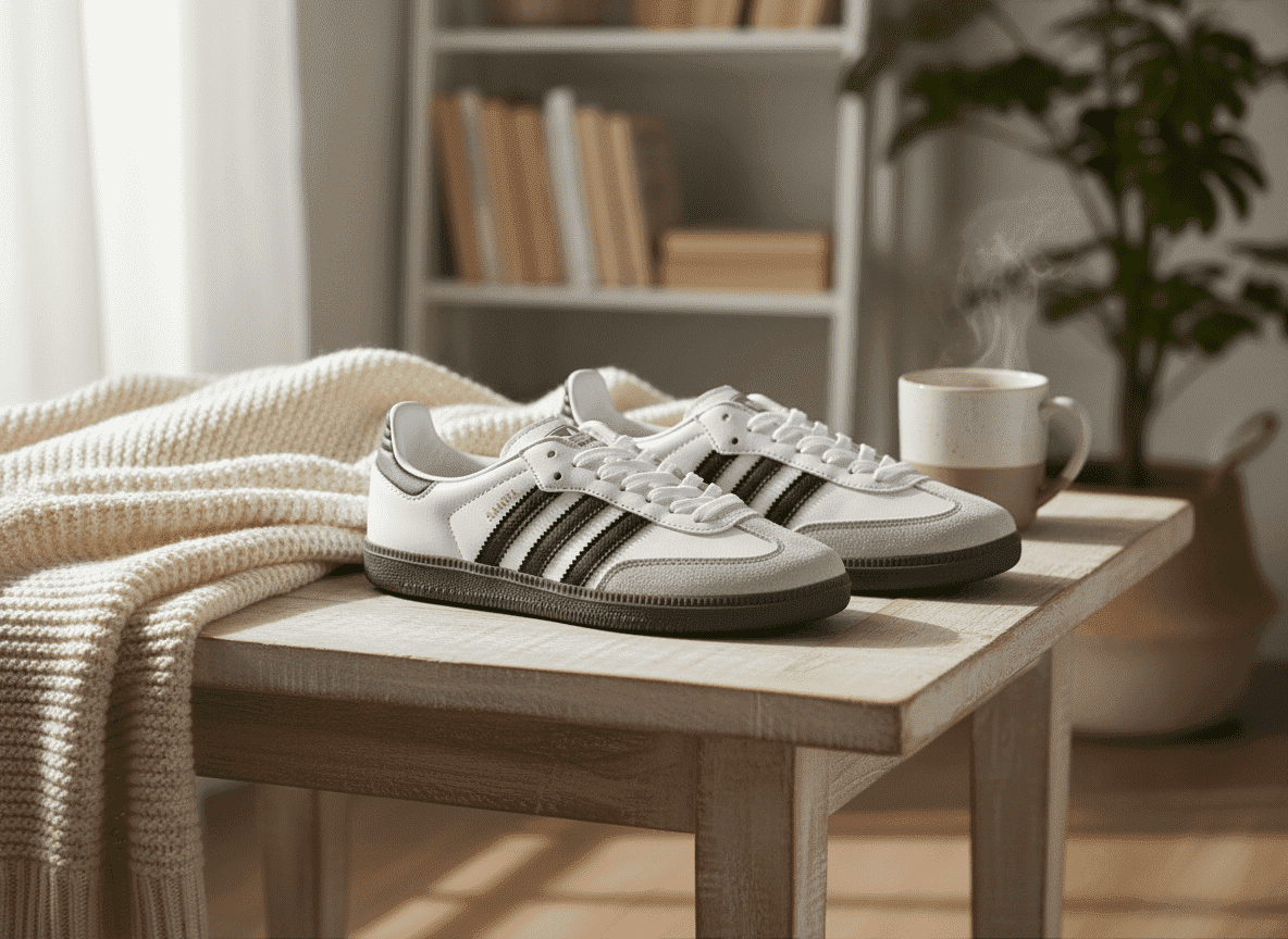 Adidas Samba White Black Sneakers feature leather and suede mix, iconic three stripes, side Samba logo, unisex design, vintage sporty vibe, comfy casual wear, perfect for everyday outfits.
