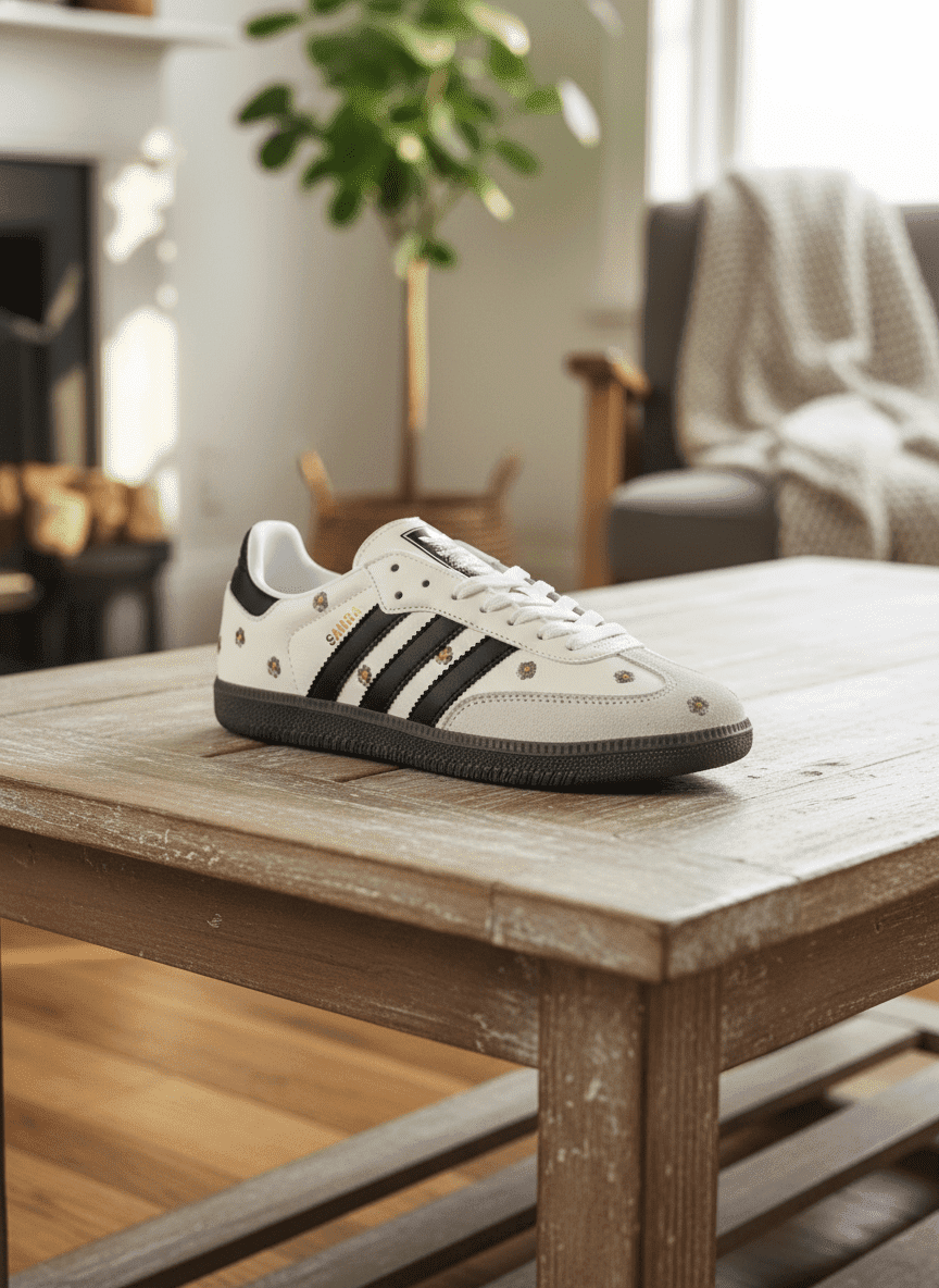 Adidas Samba White Black Brown Sneakers with leather upper, classic three stripes and floral print design, retro fashion style, unisex, comfortable, durable, perfect for casual wear.