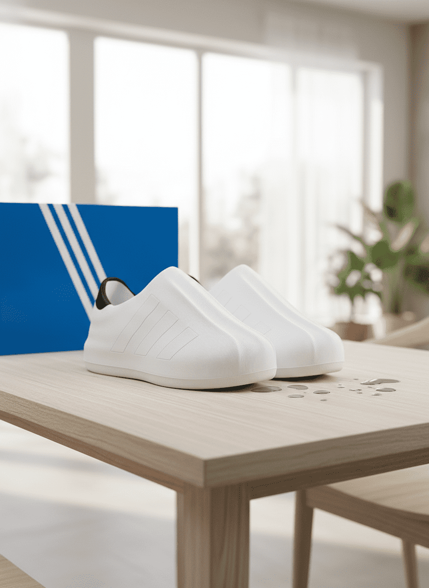 Adidas White Slip-On Casual Shoes made of lightweight EVA, breathable and comfy. Featuring embossed triple stripes, black heel design, easy slip-on style, unisex, perfect for daily sporty looks.