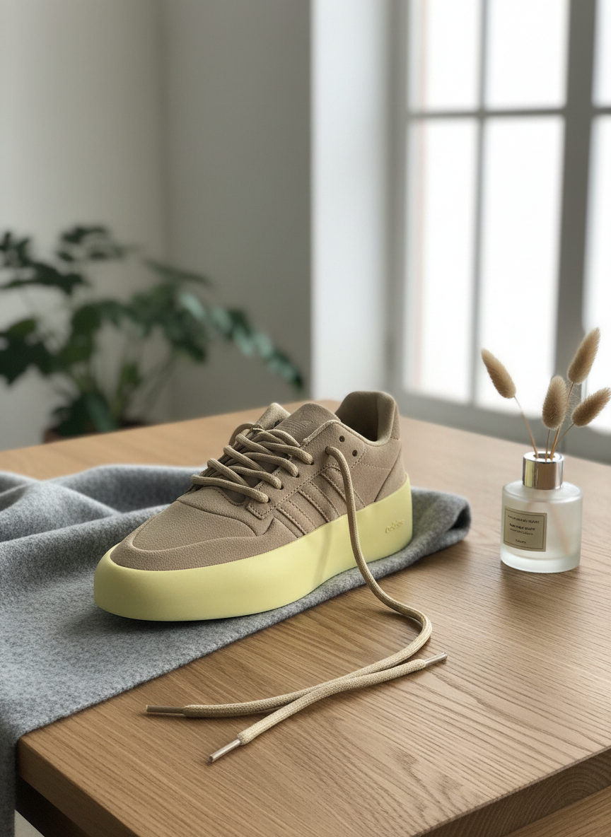 Fear of God x Adidas beige suede casual sneakers with yellow thick sole for height and comfort, classic three stripes, unisex streetwear style, soft touch, perfect for everyday wear.