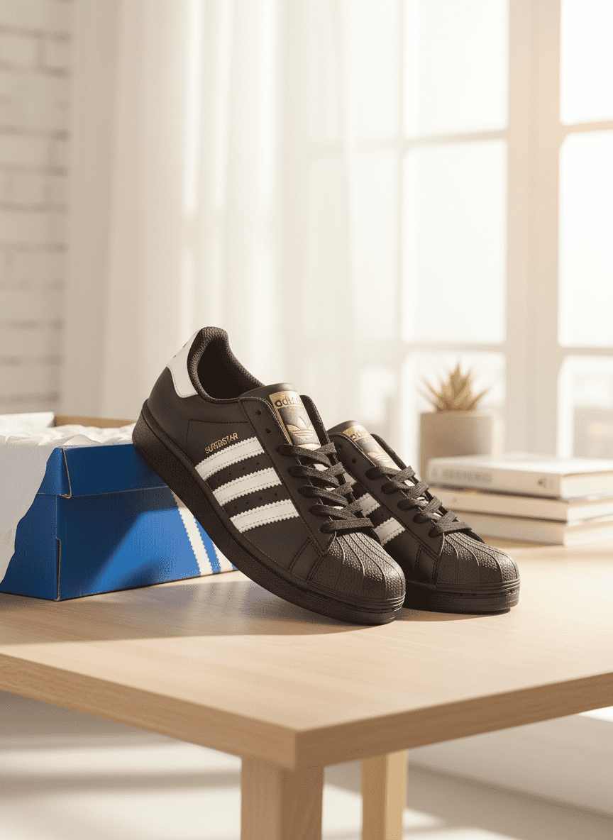 Adidas Superstar black leather sneakers with durable shell toe, silver stripes and gold logo. Breathable lining, lace-up fit, unisex design perfect for everyday casual and street style.