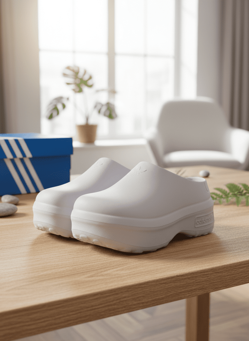 Adidas White Thick-Soled Slip-On Clogs made with lightweight, non-slip EVA. Closed toe for protection, open heel for easy wear. Stylish unisex design suits home and outdoor casual looks with comfort and height boost.